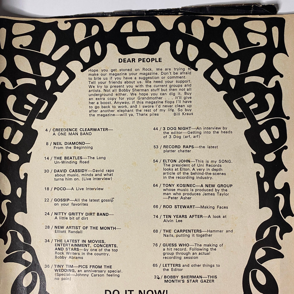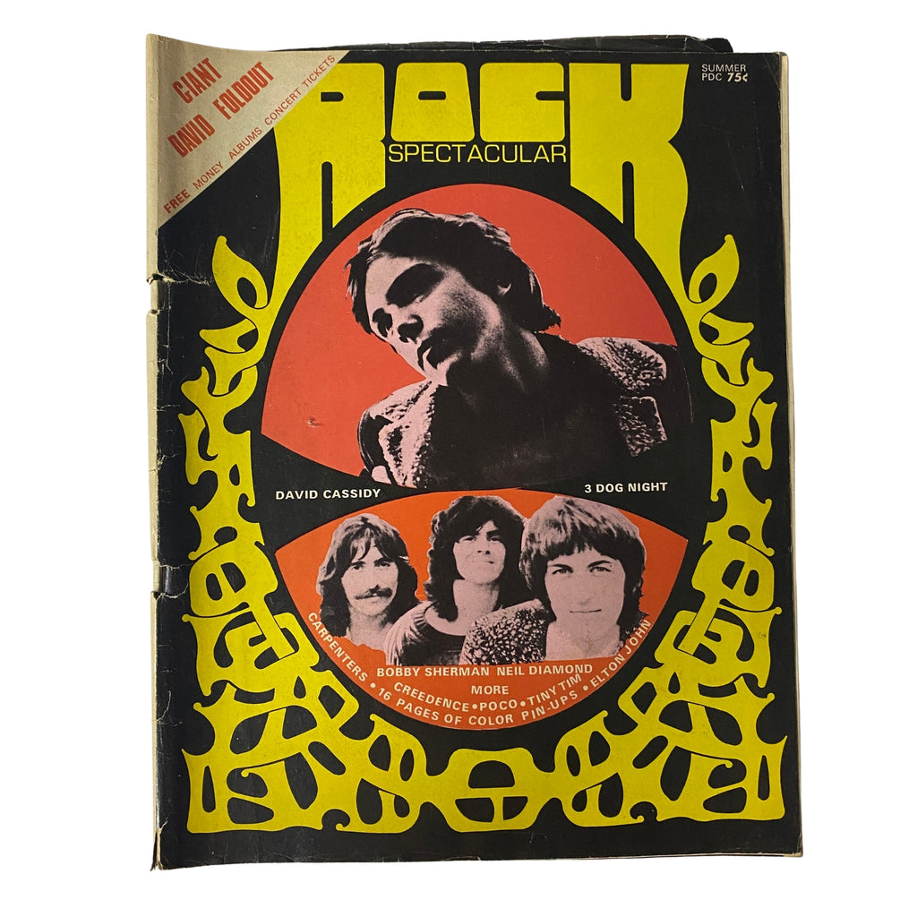 This 1970 issue of Rock Spectacular Magazine highlights two of the era’s teen idols—David Cassidy and Bobby Sherman—alongside in-depth features on some of the biggest names in rock and pop music. With live interviews, behind-the-scenes coverage, gossip columns, and special features on artists like The Beatles, Creedence Clearwater Revival, Elton John, The Carpenters, and Rod Stewart, this issue captures the energy and diversity of the 1970 music scene.