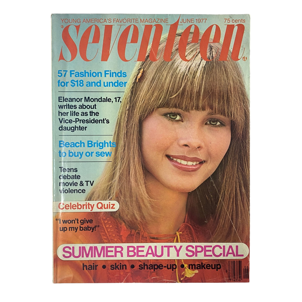 This vintage June 1977 issue of Seventeen Magazine includes a special feature by Eleanor Mondale, daughter of then–Vice President Walter Mondale, titled “My New Life as the Vice-President’s Daughter.” The issue also highlights fashion under $18, summer beauty guides, and timely cultural commentary, making it a fascinating mix of teen style and politics in the late 1970s.