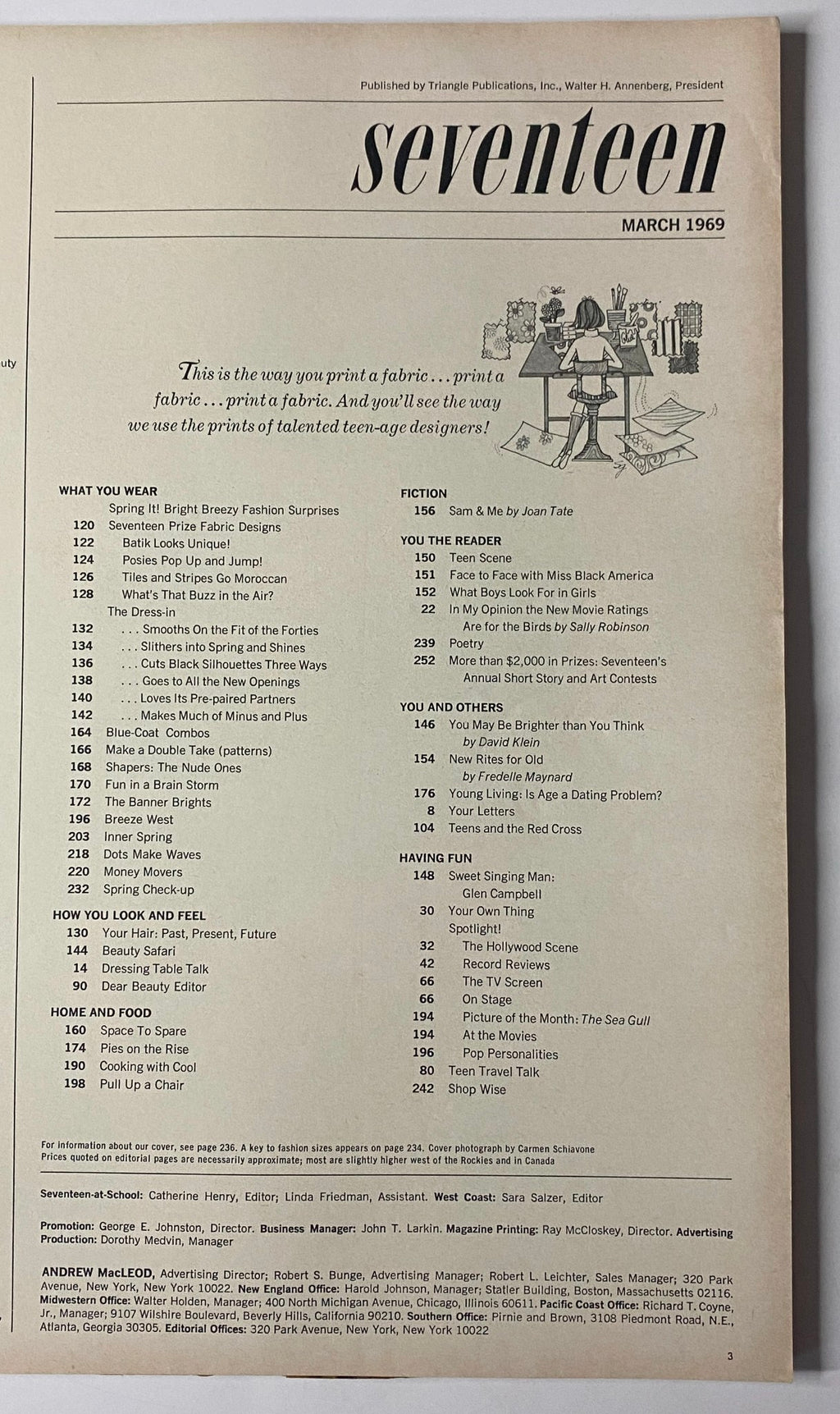 Step into the colorful world of late-'60s teen creativity with Seventeen Magazine’s March 1969 issue, published by Triangle Publications, Inc. Bursting with vibrant fashion, bold prints, and fresh beauty insights, this edition highlights youthful talent—including teen-designed fabrics—and timeless tips on “How To Have Marvelous Hair.” The magazine is in good condition, with typical wear for its age. The exact item pictured will be shipped in a protective plastic sleeve.
