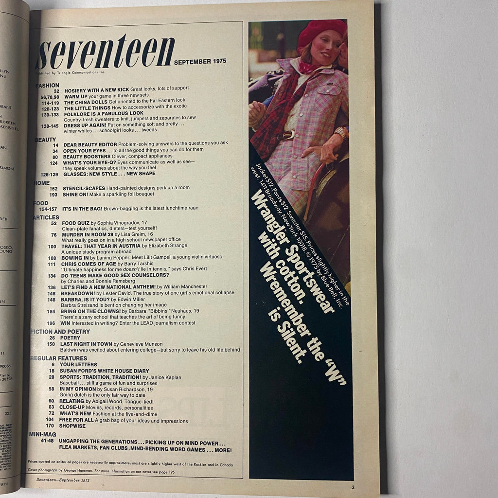 Seventeen Magazine September 1975 – Chris Evert Cover – No Label – VG