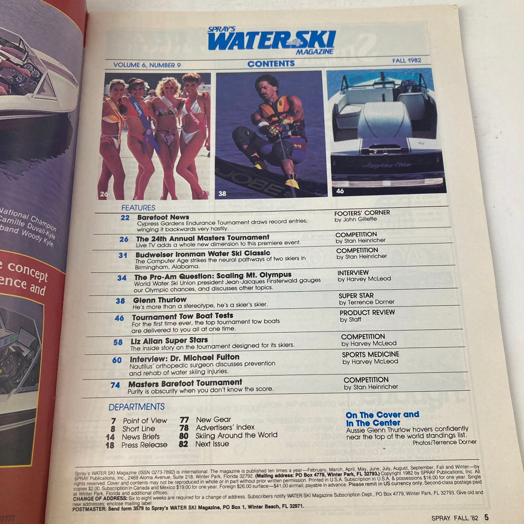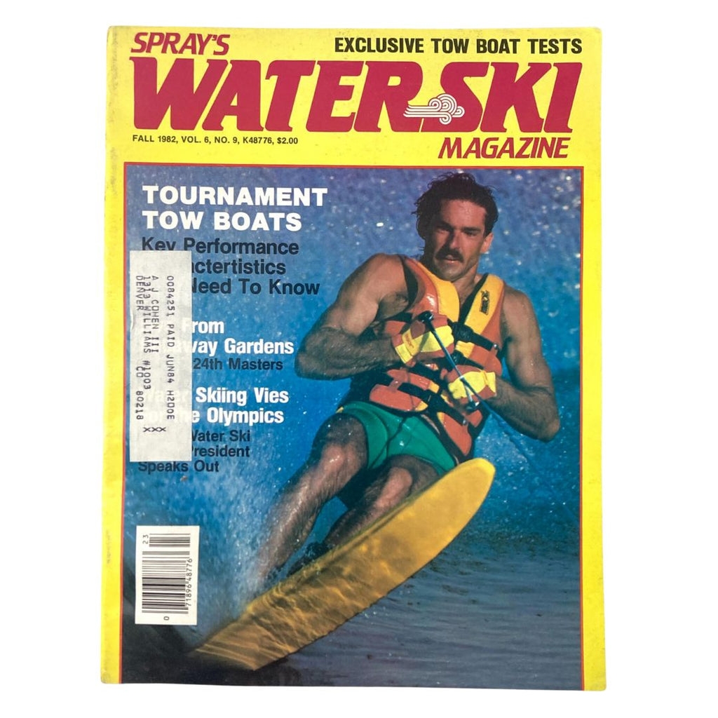 Discover the fascinating world of watersports with this Spray's Water Ski Magazine, featuring the Fall 1982 issue, Volume 6, Number 9, graced with a striking cover image of Aussie waterski champion Glenn Thurlow.