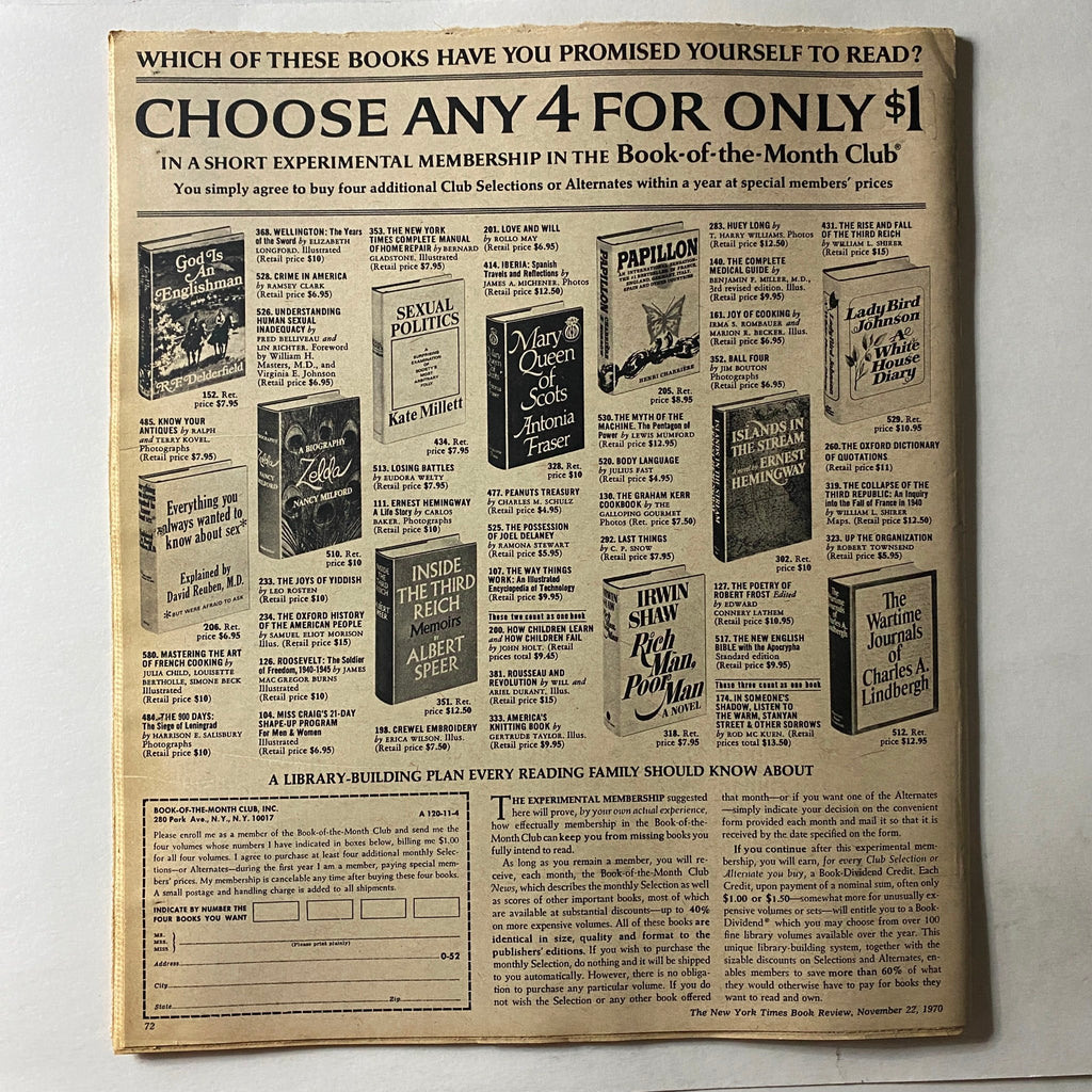 Introducing a timeless piece for collectors and enthusiasts alike, this edition of The New York Times Book Review from November 22, 1970, featuring the renowned psychologist Erik H. Erikson, is a must-have for anyone interested in literature and psychology. This copy does not bear a label but maintains its vintage charm and is in very good condition.