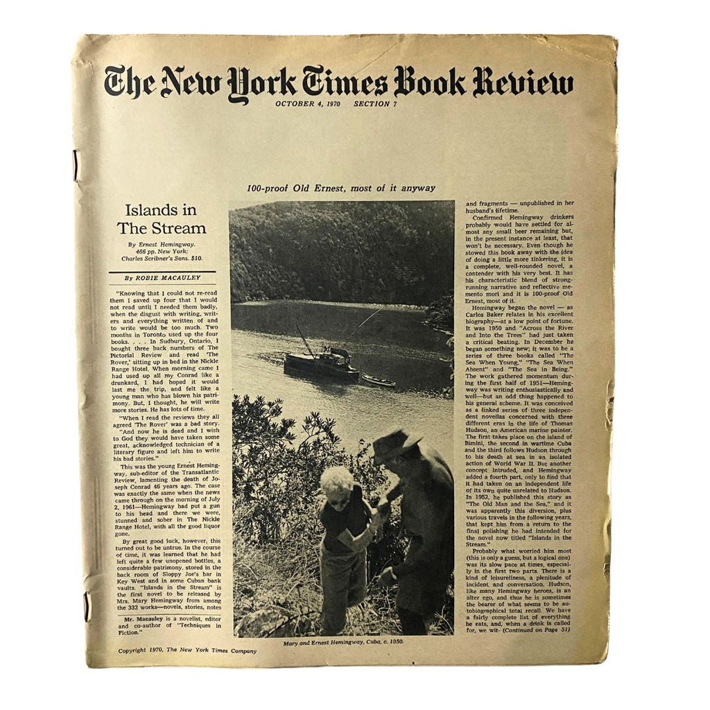 Step into the literary world of the past with the The New York Times Book Review from October 4, 1970. This collectable item features a spotlight on one of Ernest Hemingway's most celebrated works, Islands in The Stream. Whether you're a passionate bibliophile or a devoted Hemingway fan, this magazine offers a glimpse into the author's creative genius as well as the cultural context surrounding his work during the 1970s.