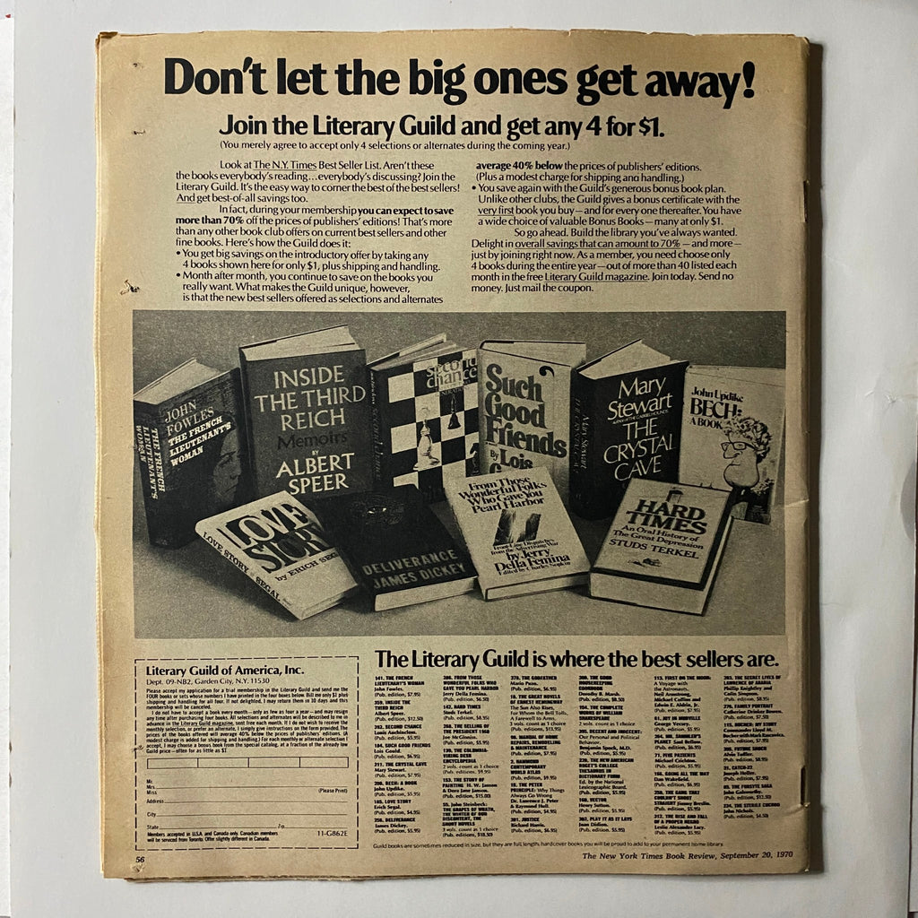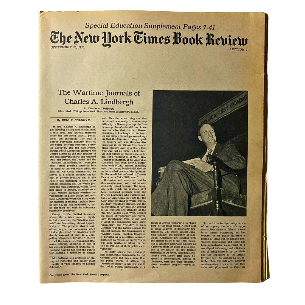 Explore a piece of history with this original copy of The New York Times Book Review from September 20, 1970, featuring an in-depth look at the iconic aviator, Charles Lindbergh. This vintage magazine is a treasure for collectors, enthusiasts of aviation, or anyone interested in the historical context of early 20th-century America.