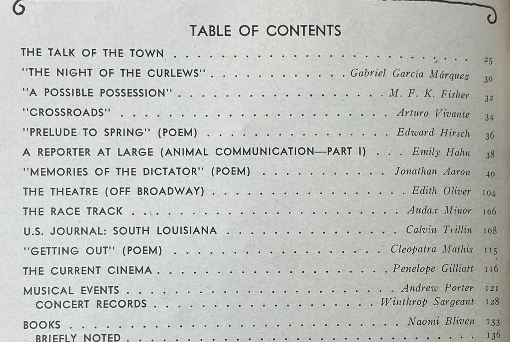 - Engaging articles such as "The Night of the Curlews" by Gabriel García Márquez and "A Possible Possession" by M. F. K. Fisher.