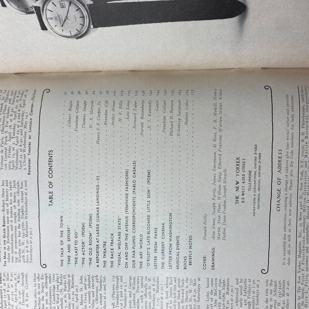 The New Yorker's ability to blend sophisticated commentary with artistic expression makes this magazine not just a reading material but a collectible time capsule. From the poetics of Thomas Snapp and W. S. Merwin to the insightful essays from notable writers like Penelope Gilliatt and Bernard Taper, this issue reflects both literary and cultural significance.