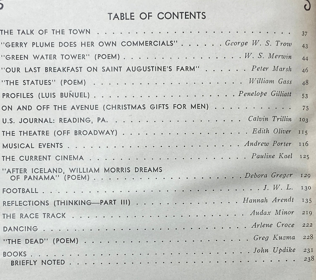 - A diverse lineup of articles, including pieces by notable writers like George W. S. Trow and Penelope Gilliatt.