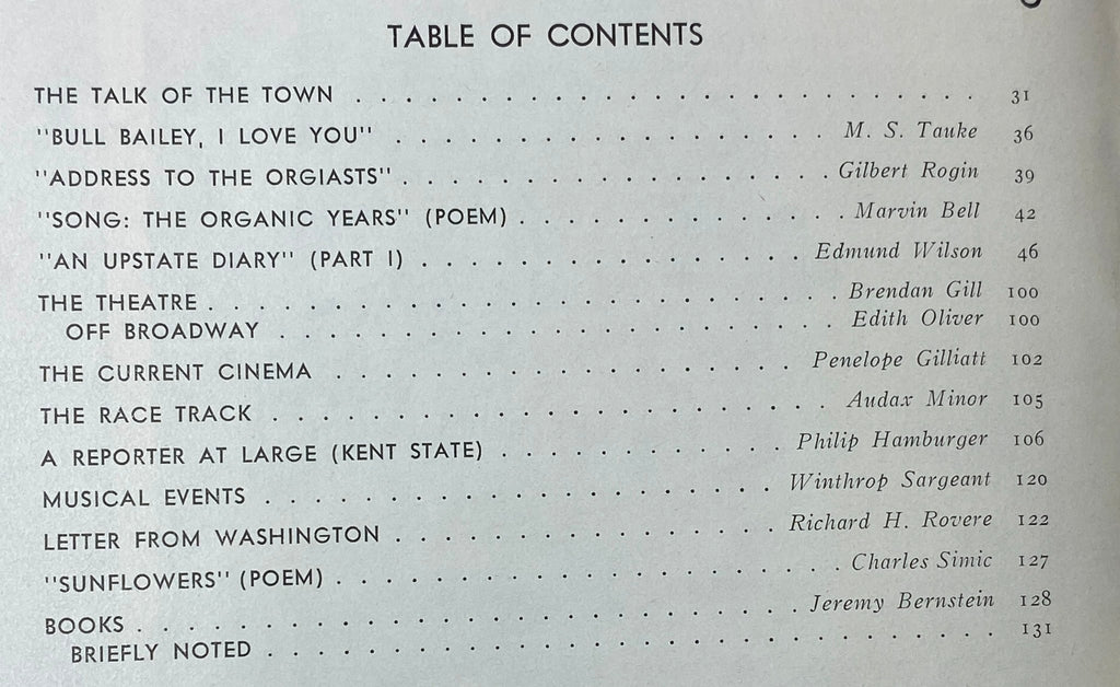 THE TALK OF THE TOWN, "BULL BAILEY, I LOVE YOU" - M. S. Taube; "ADDRESS TO THE ORGIASTS" - Gilbert Rogin; and the thought-provoking poem "SUNFLOWERS" by Charles Simic. The magazine also features sections like THE CURRENT CINEMA, a REPORTER AT LARGE on Kent State, and musings on the theatre world from Brendan Gill and Edith Oliver.