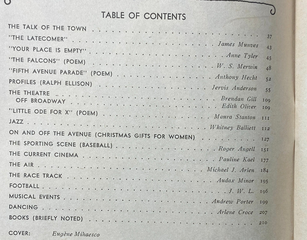 This issue is more than just a magazine; it is a snapshot of literary and artistic prowess, showcasing a variety of articles, poems, and profiles that reflect the thoughts of the era. Enjoy engaging pieces such as "The Latecomer" by James Munves and "Your Place is Empty" penned by Anne Tyler. This edition also features stunning poetry including "The Falcons" by W. S. Merwin and "Fifth Avenue Parade" by Anthony Hecht.