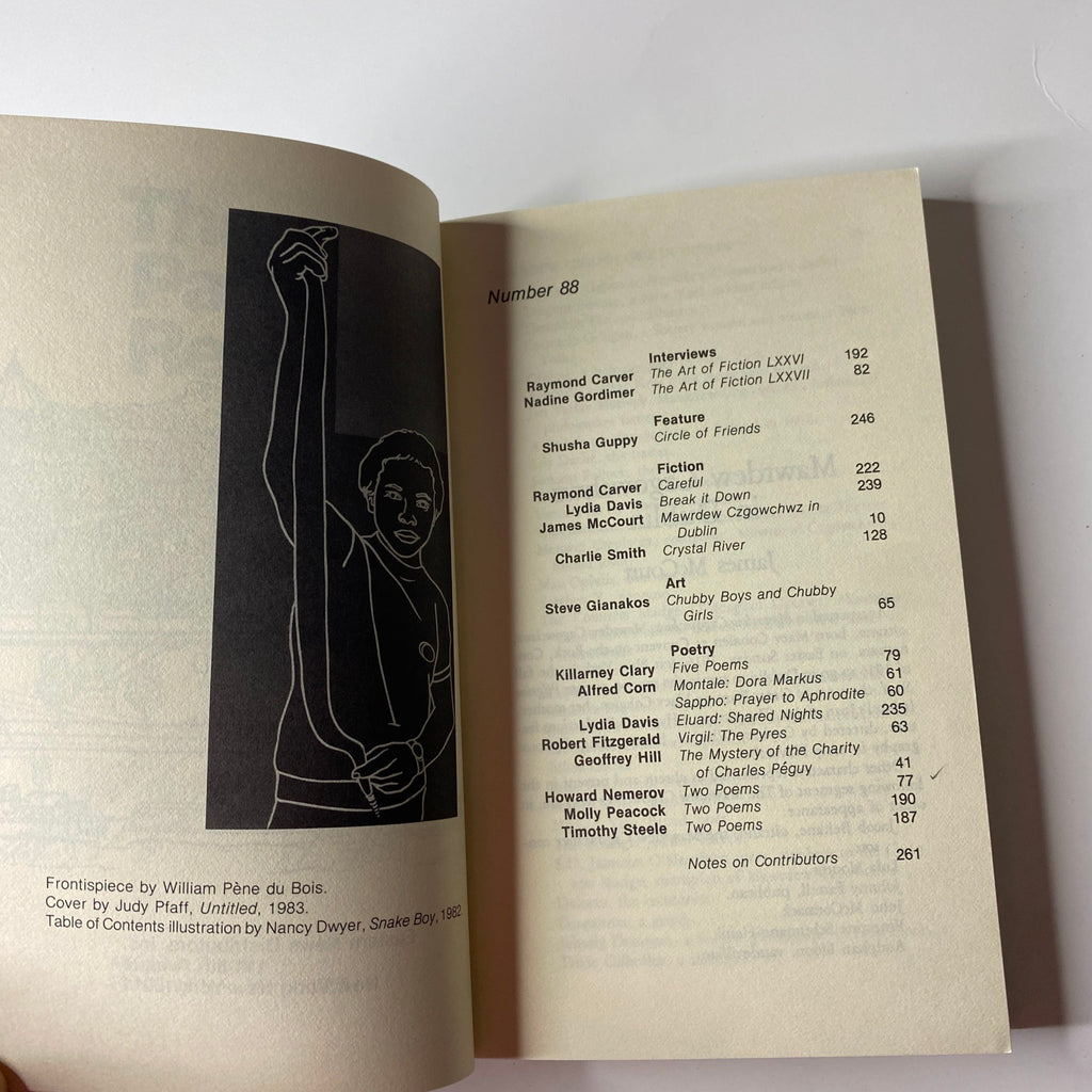 This Summer 1983 issue of The Paris Review, Number 88, features a landmark interview with Raymond Carver (The Art of Fiction LXXVI), along with a fiction contribution from Carver himself titled Careful. Also included is an interview with Nadine Gordimer (The Art of Fiction LXXVII) and standout fiction by Lydia Davis and James McCourt.