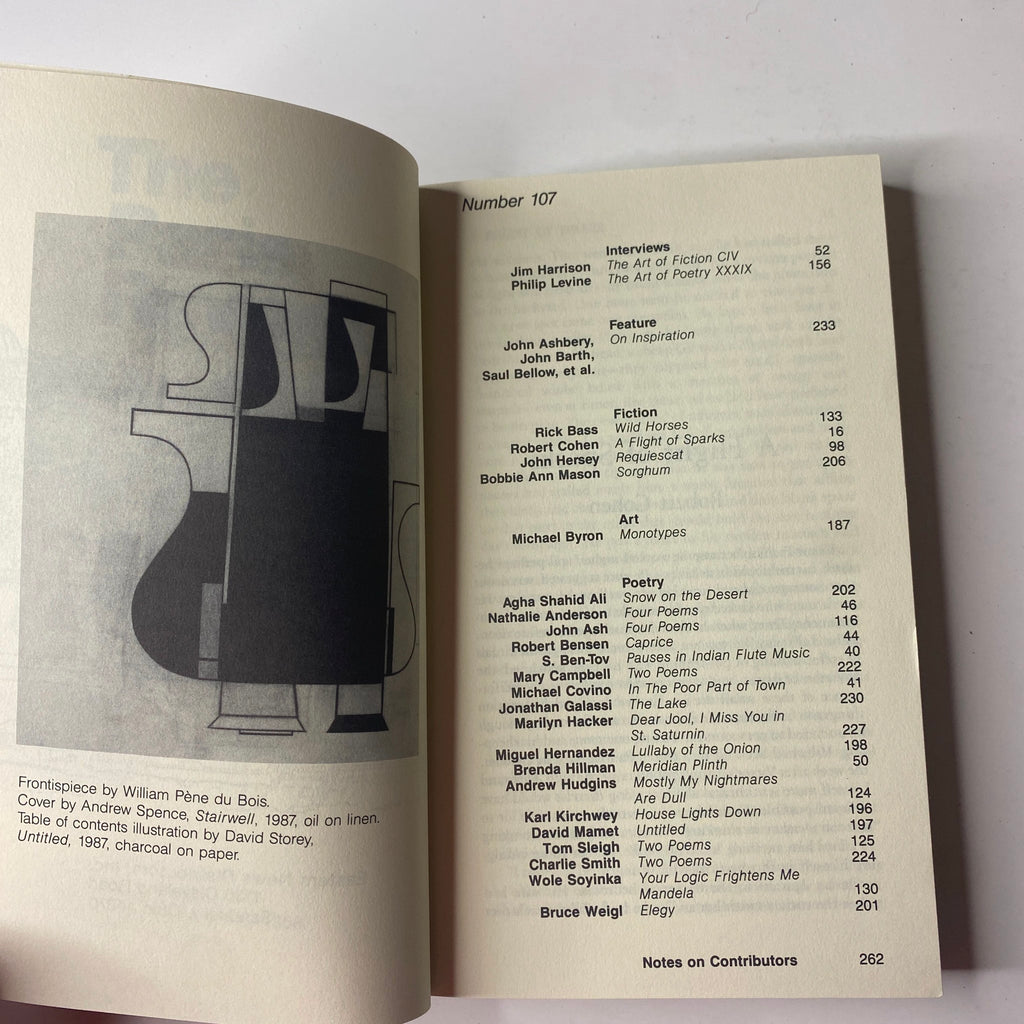 Issue No. 107 of The Paris Review (Summer 1988) presents a dynamic and varied collection of fiction, poetry, and critical insight. This edition features interviews with Jim Harrison and Philip Levine, along with the notable symposium On Inspiration, featuring reflections from John Ashbery, John Barth, Saul Bellow, and others. Fiction contributions include work by Rick Bass, Bobbie Ann Mason, and John Hersey, while the poetry section features a broad range of voices including Wole Soyinka, Marilyn Hacker, and David Mamet.
