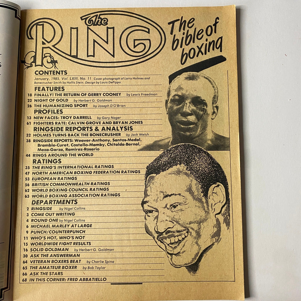 The Ring Magazine – January 1985 (Larry Holmes & James “Bonecrusher” Smith Cover, No Label, Very Good Condition)