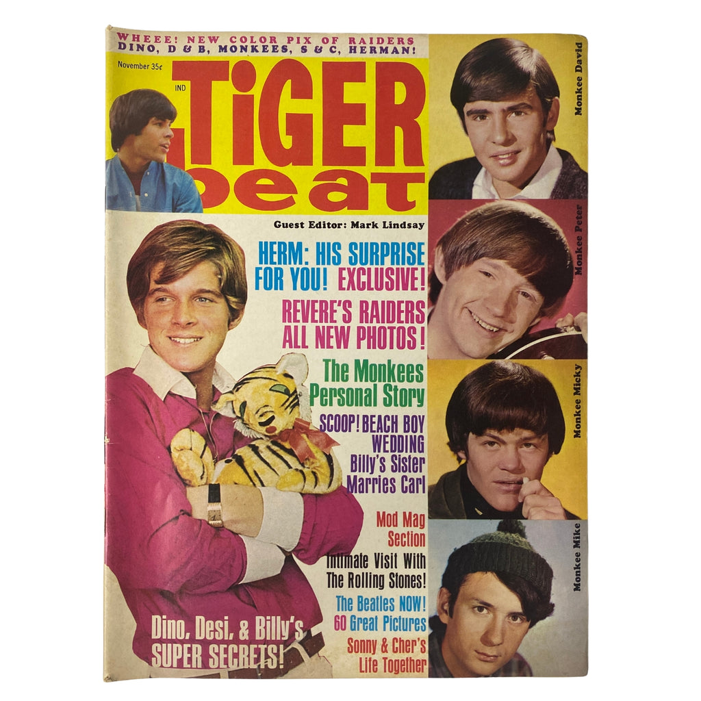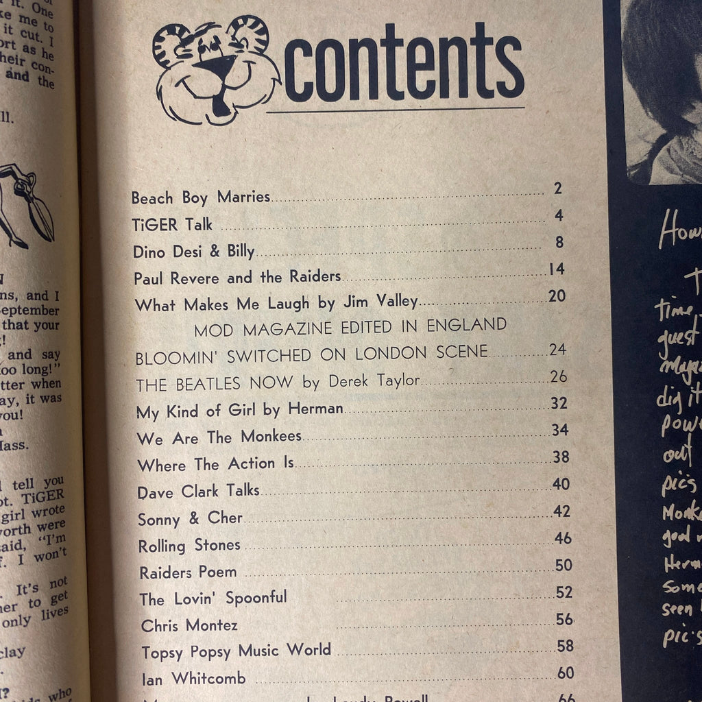 This November 1966 issue of Tiger Beat Magazine highlights teen idols Dino, Desi & Billy in a featured article, alongside exclusive stories on The Beatles, The Monkees, Paul Revere & The Raiders, Sonny & Cher, The Rolling Stones, and more. Known for its bold photography, fan-centered writing, and colorful features, Tiger Beat was one of the most influential teen magazines of the 1960s.