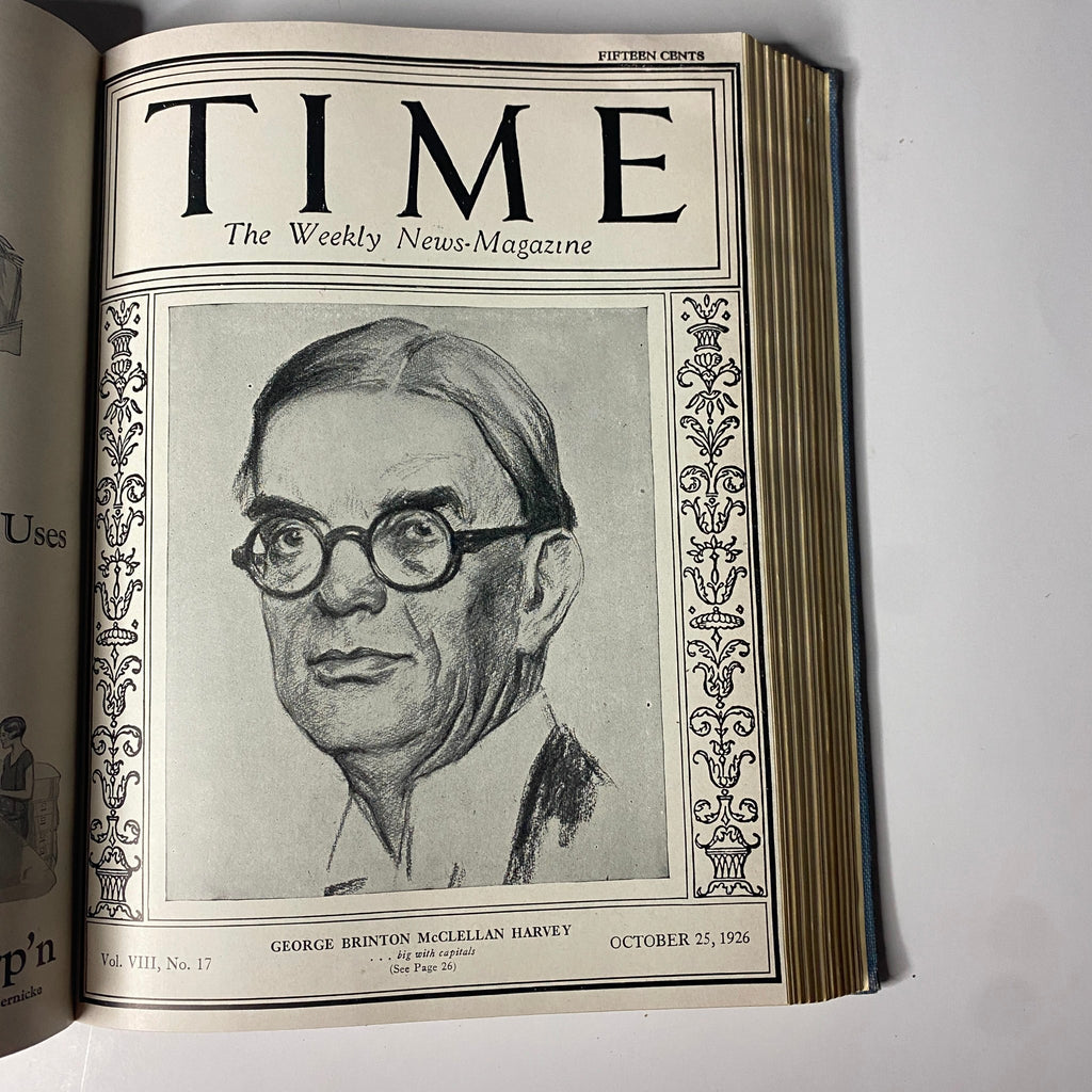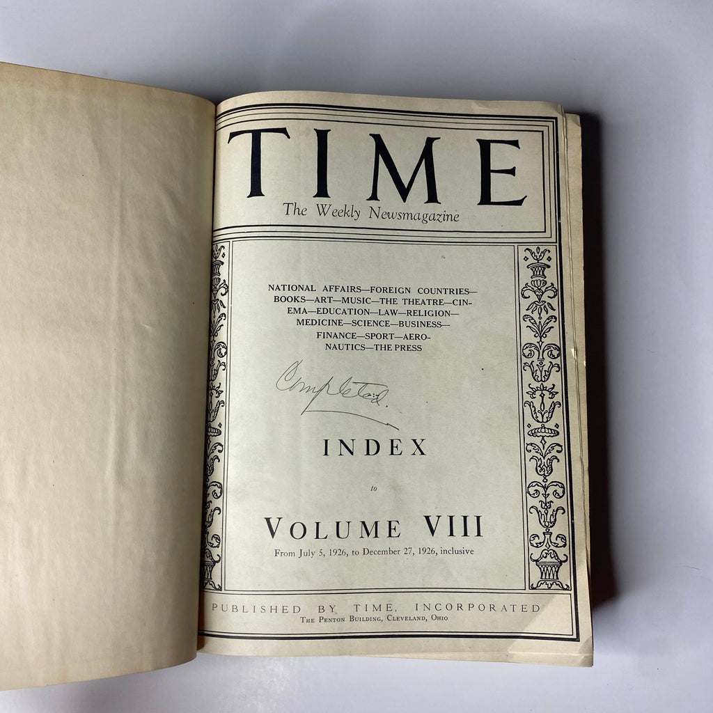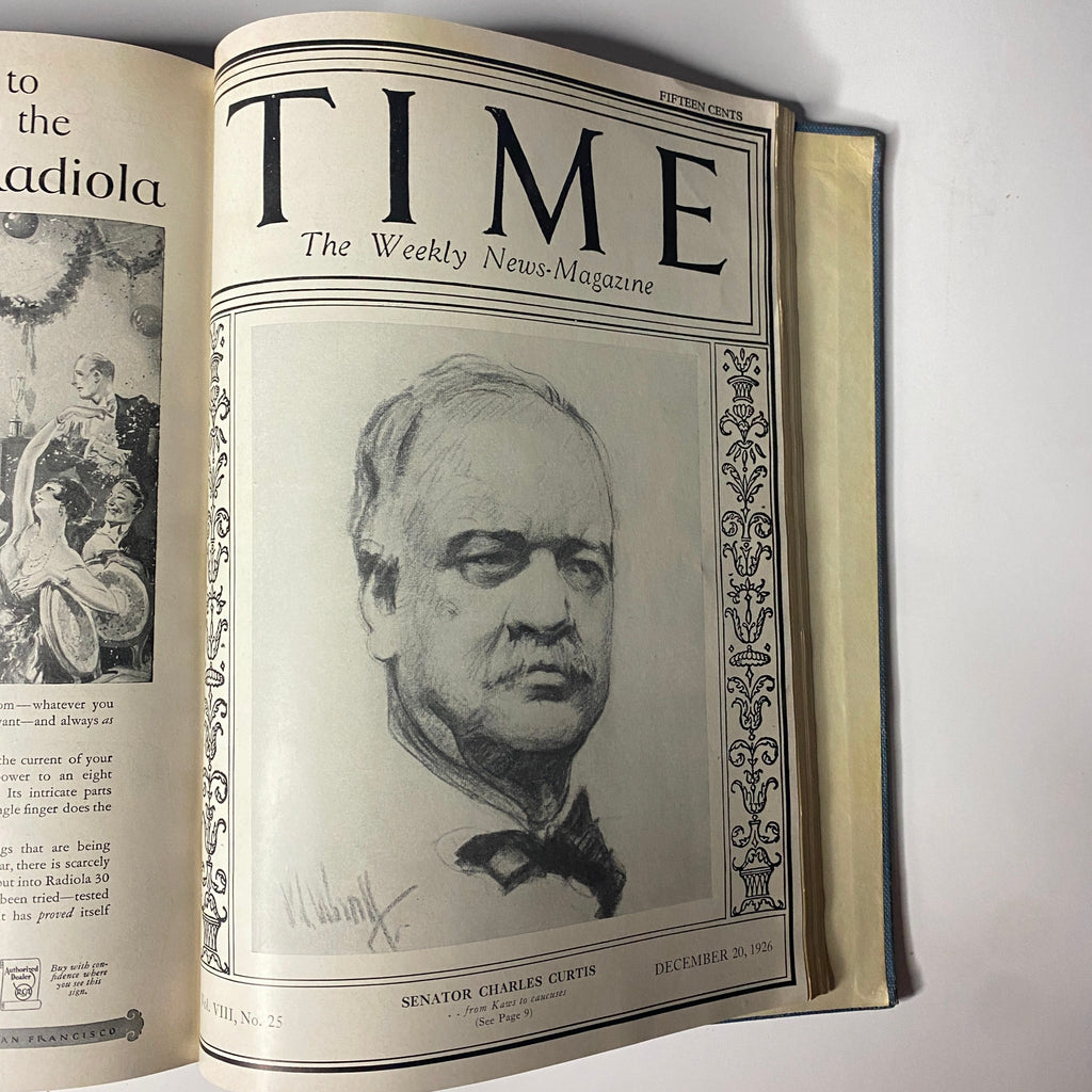 This listing features a complimentary bound volume of Time Magazine, containing weekly issues from July through December 1926. Despite some flaws—including occasional rips, cutouts, and front creasing—this volume remains a valuable historical resource, featuring many notable public figures and cultural moments from the late 1920s.
