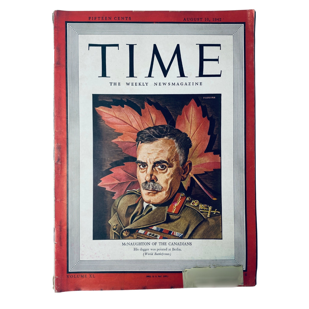 This original issue of Time Magazine, dated August 10, 1942, features General Andrew McNaughton, commander of Canada’s overseas forces, on the cover. As a key figure in Canada's military leadership during World War II, McNaughton was known for his scientific approach to warfare and his deep commitment to maintaining Canadian command over its troops within the Allied structure. This issue explores his military philosophy, strategic role in the war effort, and Canada’s evolving contributions to the global conflict.
