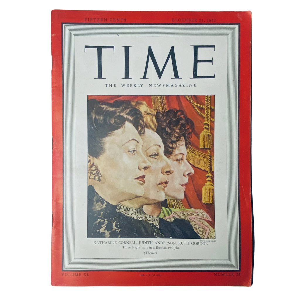 This original issue of Time Magazine, dated December 21, 1942, features Katharine Cornell, Judith Anderson, and Ruth Gordon on the cover—three of the most celebrated women in American theater at the time. Published during the height of World War II, this issue highlights the enduring importance of the arts and stage performance, even as global conflict reshaped daily life. The cover story delves into their respective careers, unique acting styles, and contributions to the dramatic arts during a turbulent era.