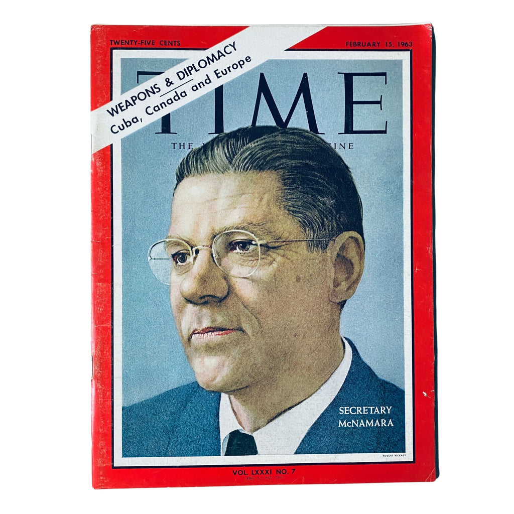 This vintage issue of Time Magazine, dated February 15, 1963 (Vol. 81, No. 7), features U.S. Secretary of Defense Robert McNamara on the cover. A former president of Ford Motor Company, McNamara was known for applying systems analysis and management efficiency to the Pentagon. During his tenure under Presidents Kennedy and Johnson, he played a pivotal role in shaping U.S. defense strategy and policy during the early years of the Vietnam War and the Cold War military buildup.