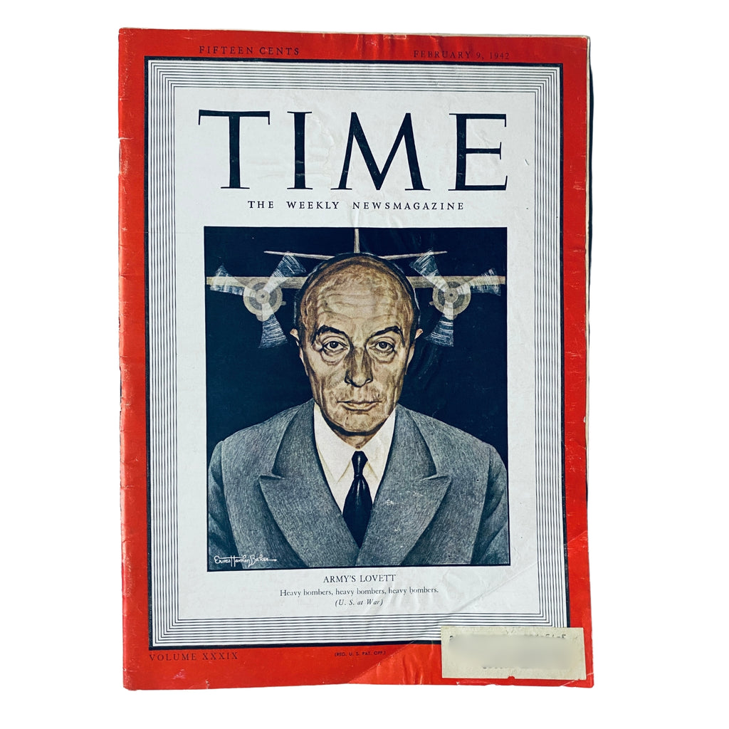 This vintage issue of Time Magazine, dated February 9, 1942 (Vol. 39, No. 6), features Robert A. Lovett on the cover. At the time, Lovett was serving as U.S. Assistant Secretary of War for Air, playing a pivotal role in coordinating American air power during World War II. A key architect of the U.S. military's strategic air operations, Lovett was instrumental in shaping the expansion and modernization of the Army Air Forces, laying the groundwork for American air superiority throughout the war.