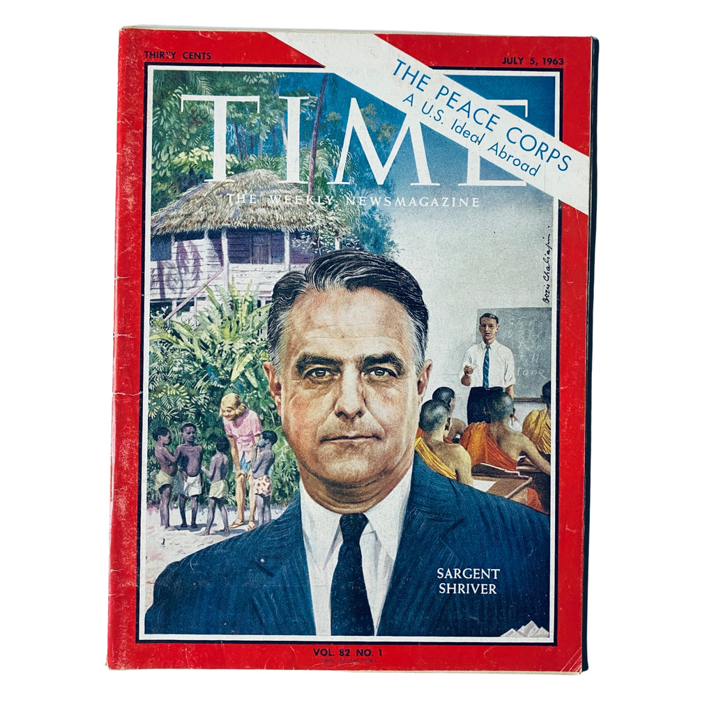 This vintage issue of Time Magazine, dated July 5, 1963 (Vol. 82, No. 1), features Sargent Shriver on the cover. As the first Director of the Peace Corps, Shriver was instrumental in shaping one of President John F. Kennedy’s most enduring legacies. His leadership helped launch a global movement of service, sending young Americans abroad to promote education, healthcare, and economic development in underserved communities. Shriver was also a key figure in the War on Poverty and later served as U.S. Ambassador to France.