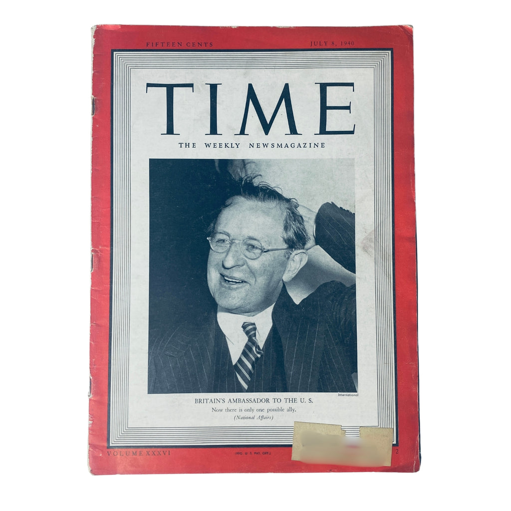 This original issue of Time Magazine, dated July 8, 1940, features Philip Henry Kerr, 11th Marquess of Lothian—better known as Lord Lothian—on the cover. As the British Ambassador to the United States during a pivotal moment in World War II, Lord Lothian played a critical role in strengthening Anglo-American relations. His diplomatic efforts helped pave the way for U.S. support of Britain prior to America's formal entry into the war, including the vital Lend-Lease Act.
