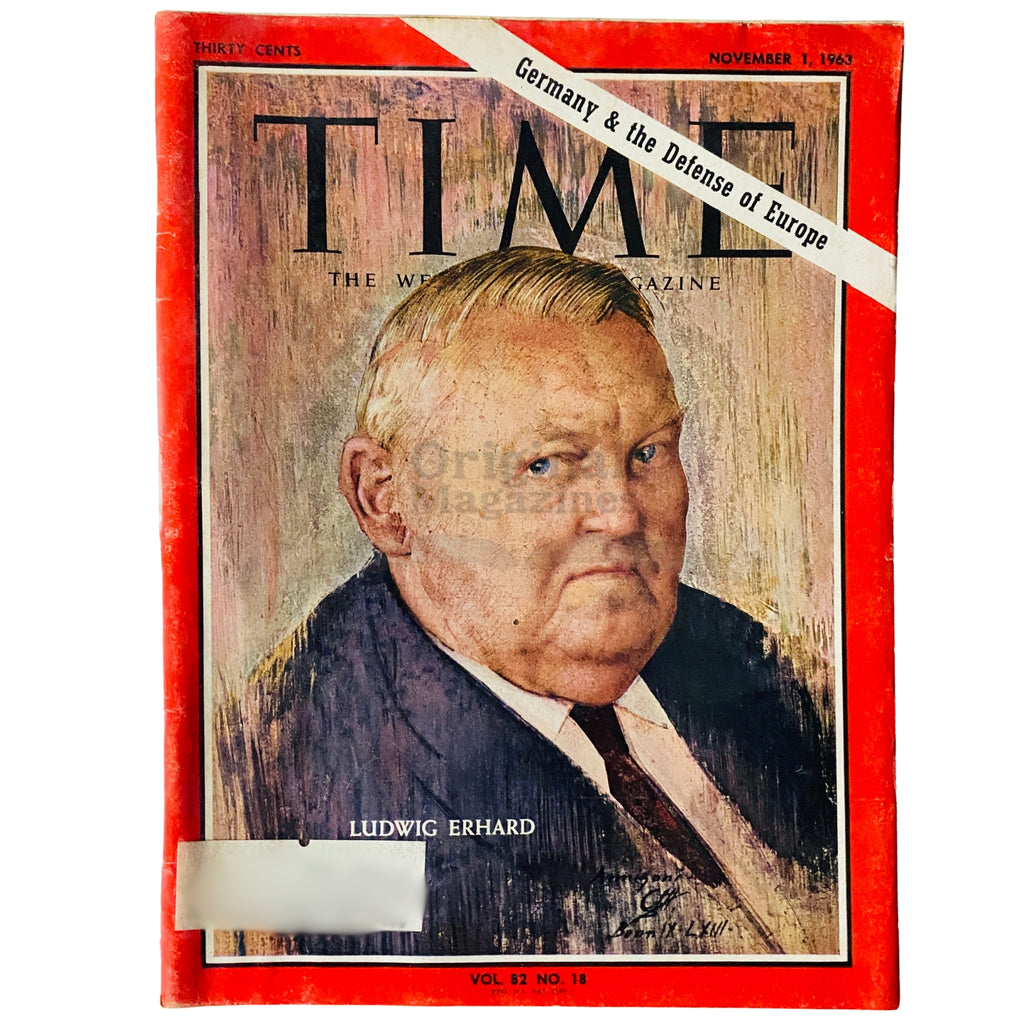 Discover a piece of history with this vintage magazine: Time Magazine, November 1, 1963, Vol 82 No. 18, featuring a striking cover of Ludwig Erhard, the renowned German politician and key figure in the economic recovery of West Germany post-World War II.