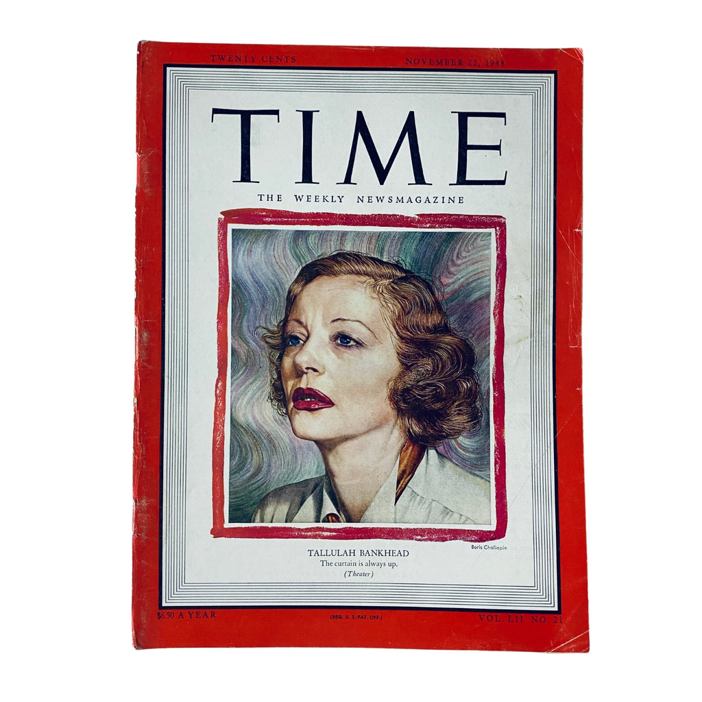 This vintage issue of Time Magazine, dated November 22, 1948 (Vol. 52, No. 21), features the acclaimed actress and Broadway legend Tallulah Bankhead on the cover. Known for her magnetic stage presence, sharp wit, and dramatic flair, Bankhead was a towering figure in American theater and Hollywood during the mid-20th century. By 1948, she had become a cultural icon, equally celebrated for her outspoken personality as for her work in productions such as The Little Foxes and Alfred Hitchcock’s Lifeboat.