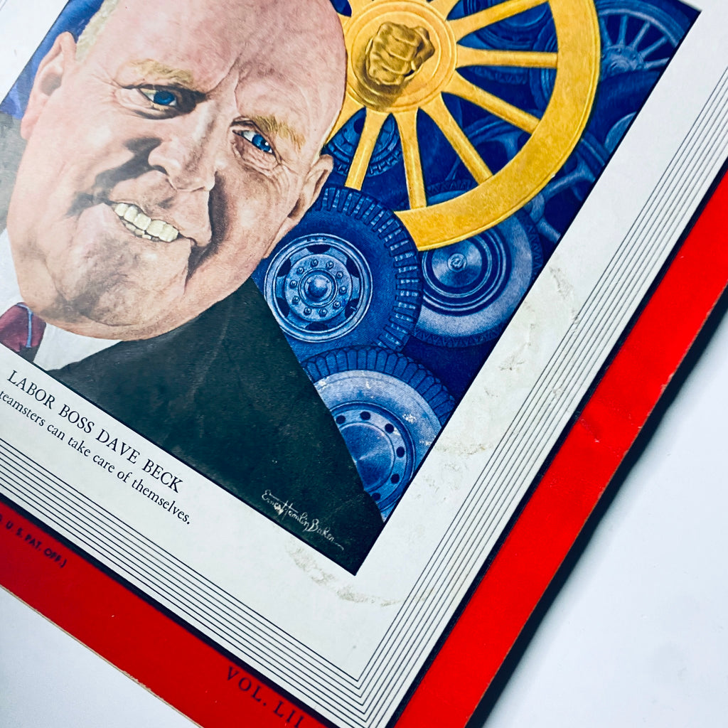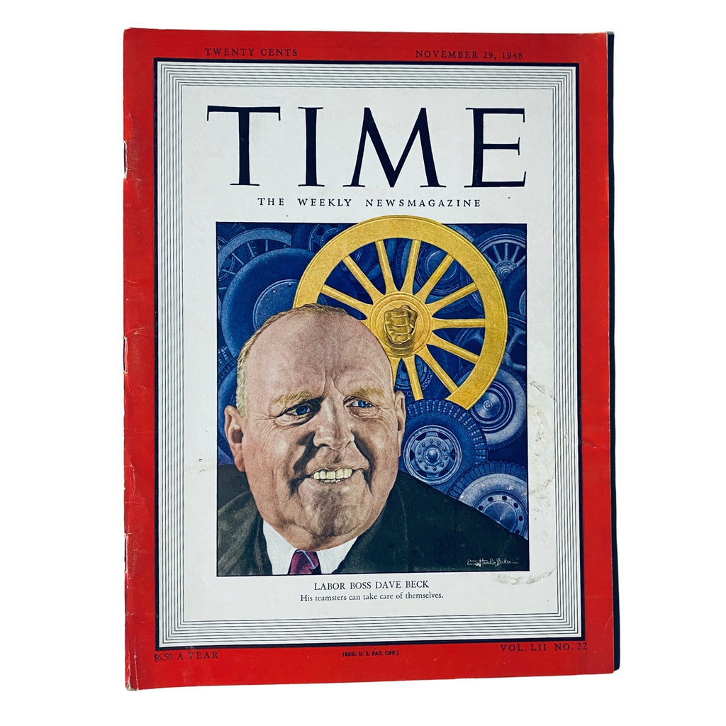 This vintage issue of Time Magazine, dated November 29, 1948 (Vol. 52, No. 22), features labor leader Dave Beck on the cover. As a powerful figure within the Teamsters Union, Beck played a major role in shaping postwar American labor. Known for his organizational skills and strong leadership, he helped expand the influence of the Teamsters across the country. Beck's legacy, however, would later be marred by controversy, as investigations into union corruption brought his tenure under scrutiny in the years that followed.