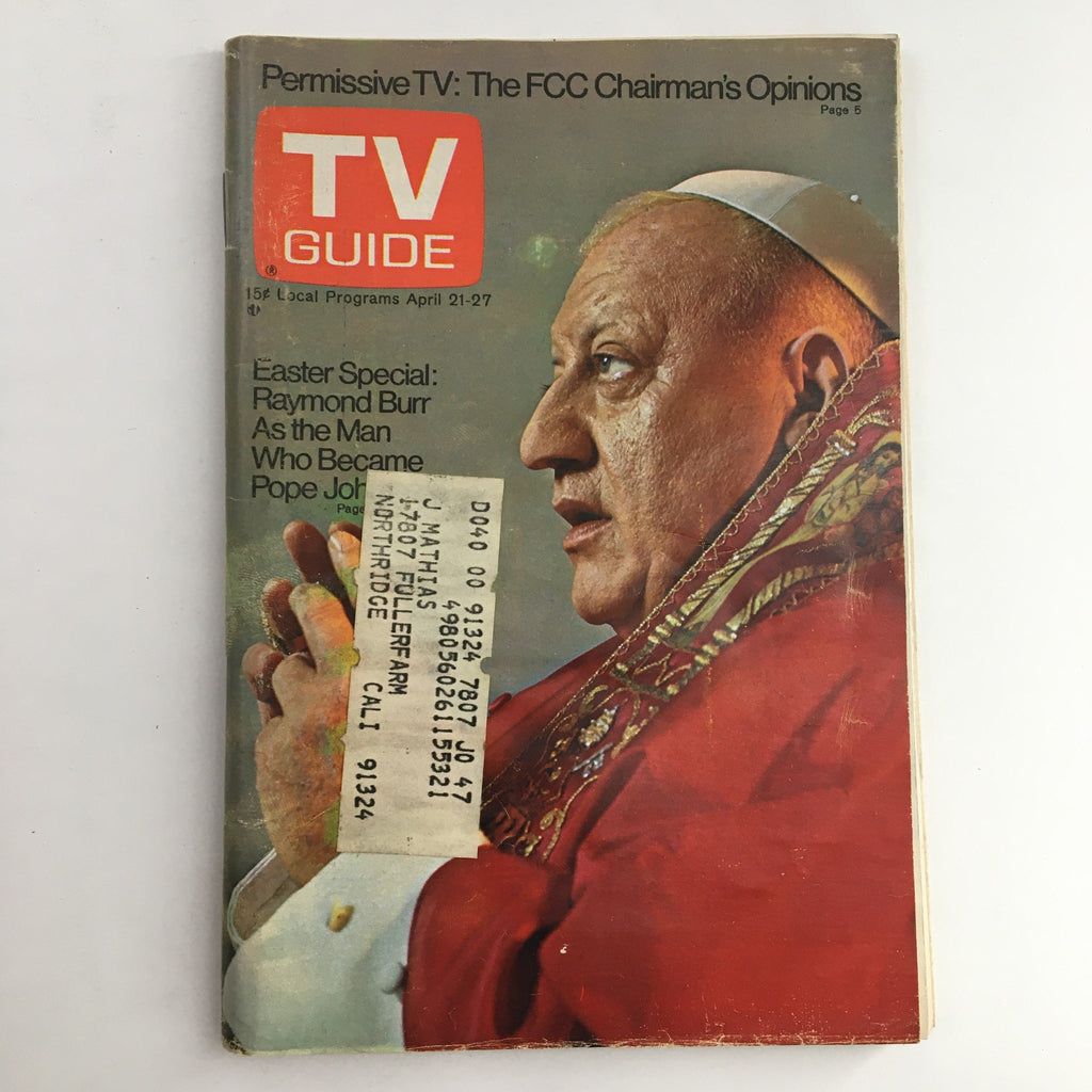 Discover a piece of television history with the TV Guide Magazine - April 21, 1973, featuring a striking cover of Raymond Burr as Pope John XXIII. This unique L.A. edition is a must-have for collectors and enthusiasts of vintage magazines.