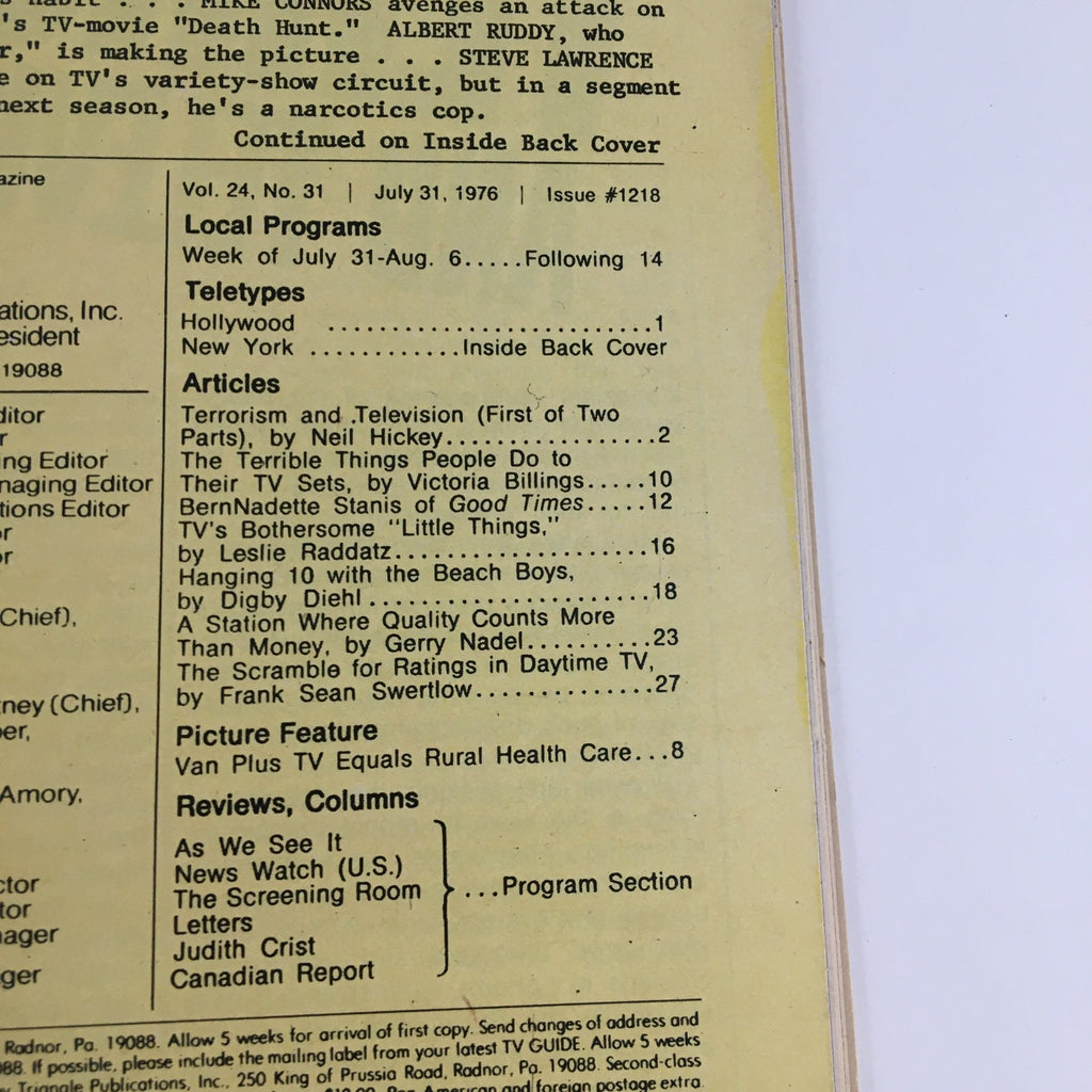Discover an intriguing piece of television history with the TV Guide Magazine July 31, 1976 L.A. Edition. This vintage magazine captures the essence of a groundbreaking era in entertainment and offers a profound look into societal issues, specifically terrorism and its representation on television.