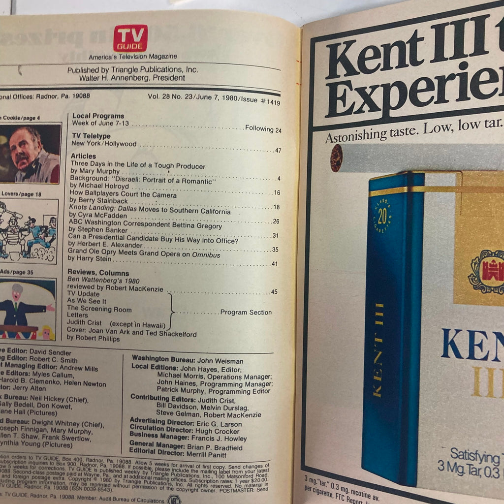Step into the world of nostalgia with the TV Guide Magazine June 7, 1980 #1419, featuring the unforgettable stars Joan Van Ark and Ted Shackelford from the iconic television soap opera, Knots Landing. This vintage magazine serves as a fascinating time capsule of TV history, perfect for collectors and enthusiasts alike.