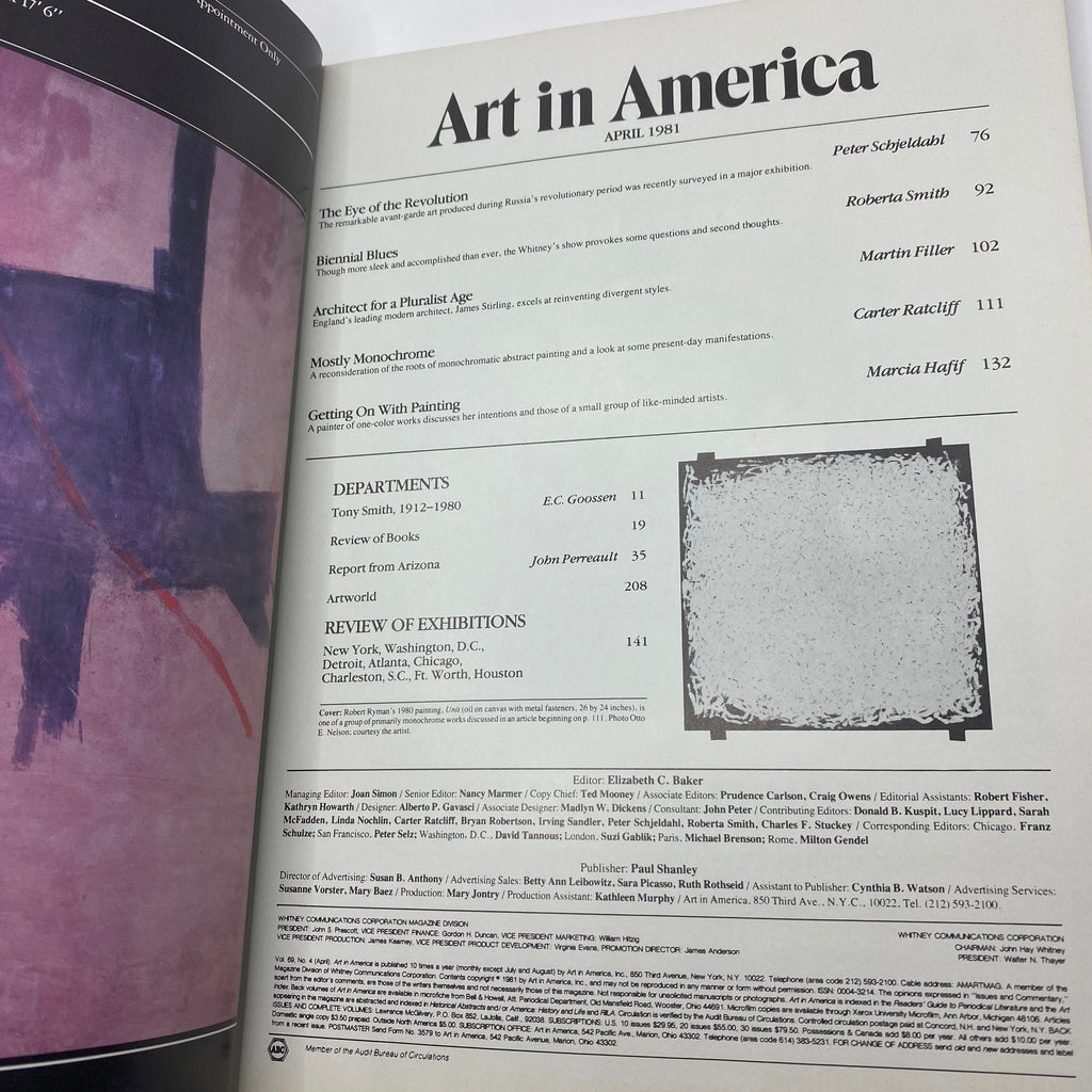 The Art in America Magazine, April 1981 edition, featuring the renowned Robert Ryman's Unit No Label, is a must-have for collectors of vintage magazines. This vintage issue encapsulates the essence of contemporary art during the pivotal 1980s, highlighting Ryman's unique contributions to the art world. It offers readers a rare insight into the spirit of the time and the evolution of abstract expressionism.