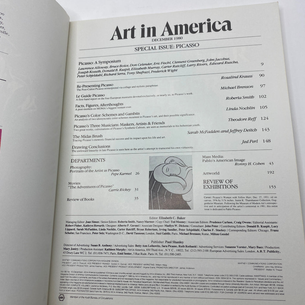 Explore the artistic world of Art in America with this December 1980 issue, dedicated to the renowned artist Pablo Picasso. This vintage magazine is a must-have for collectors and art enthusiasts alike, showcasing in-depth features about Picasso's work during a pivotal time in contemporary art history.