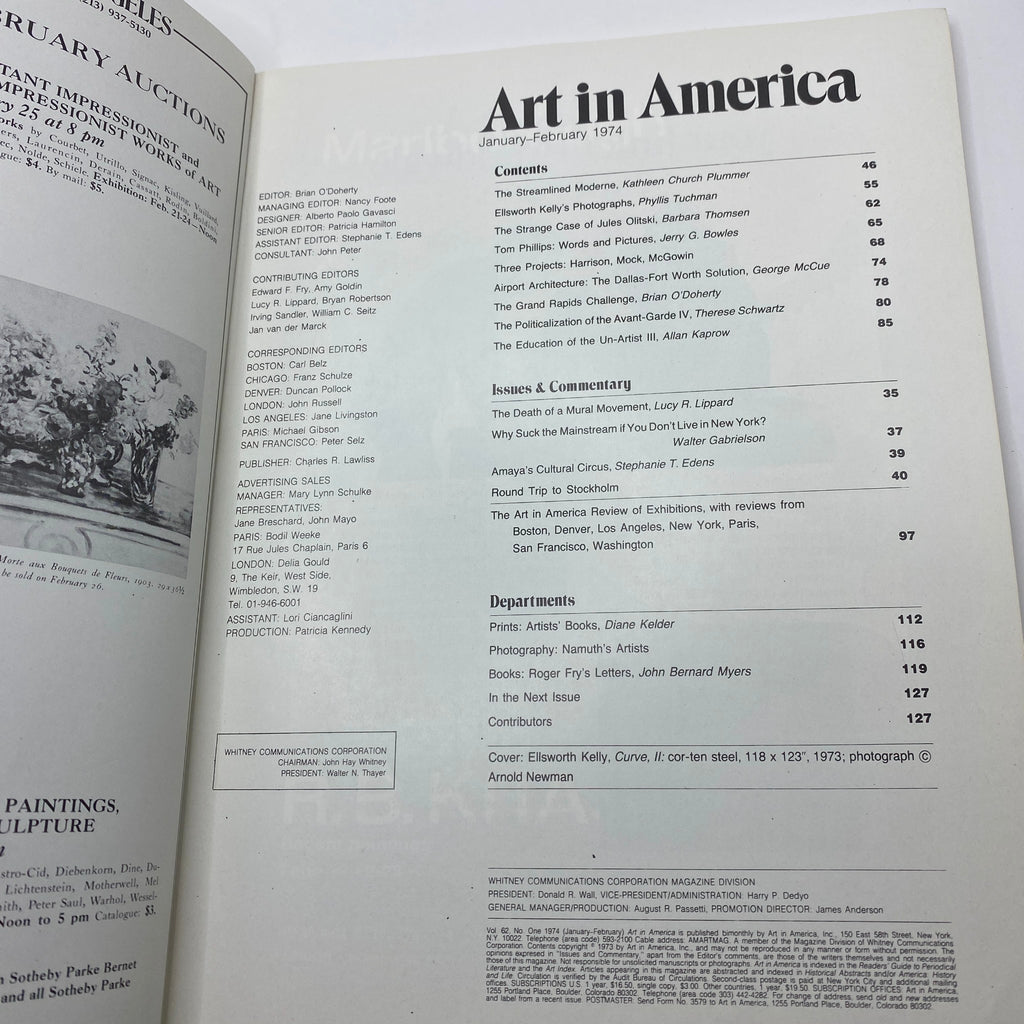 Don’t miss out on this unique opportunity to own a piece of art history. Add the VTG Art in America Magazine from January 1974 featuring Ellsworth Kelly’s "Curve II" to your collection today!