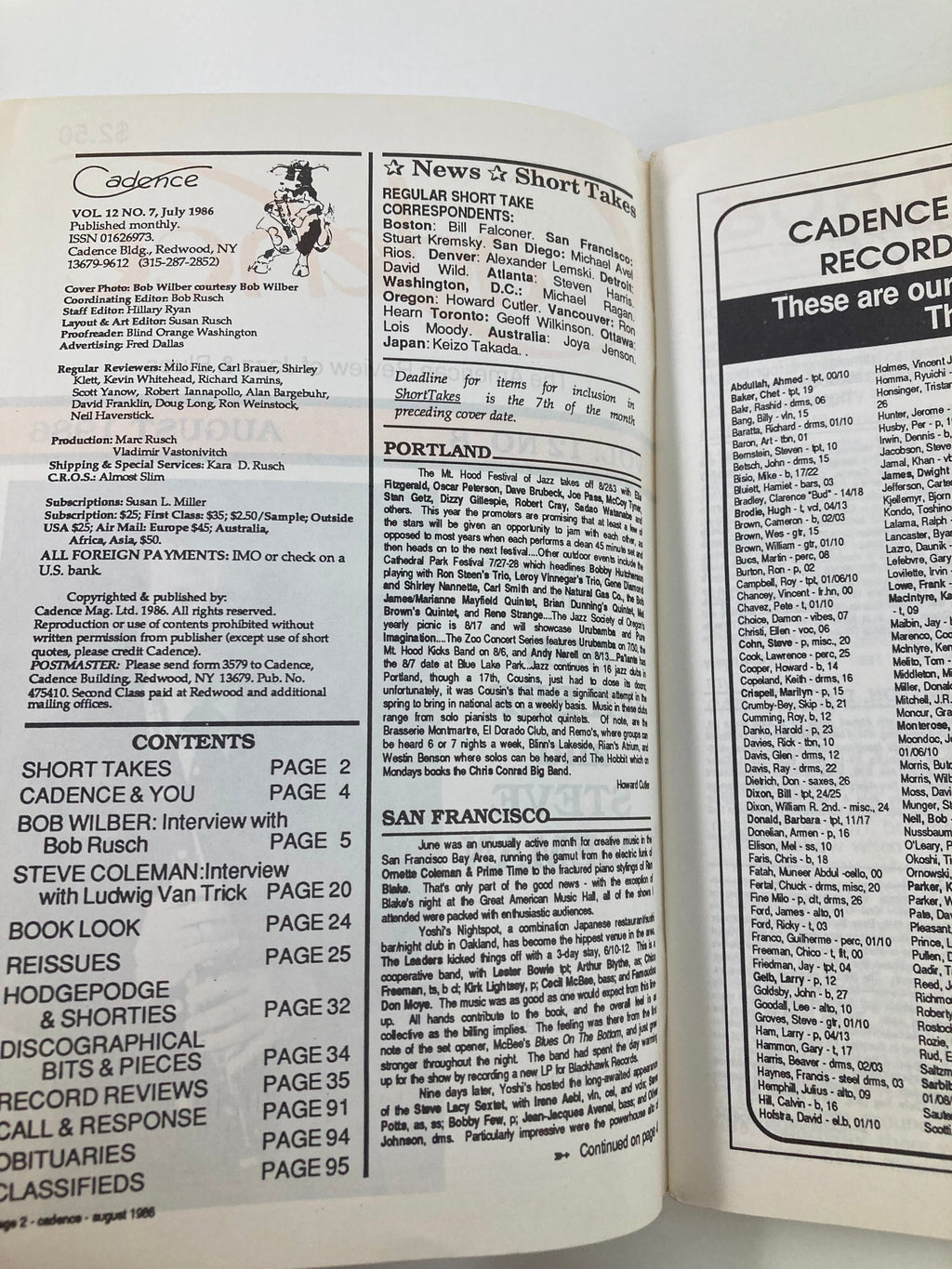 Discover a timeless piece of jazz history with the Cadence Jazz Magazine from August 1986, Vol. 12 No. 8. This vintage magazine features exclusive insights into the world of jazz music, including interviews with notable musicians such as Bob Wilber and Steve Coleman. Whether you're a collector or a jazz enthusiast, this issue presents an essential addition to your collection of vintage magazines.