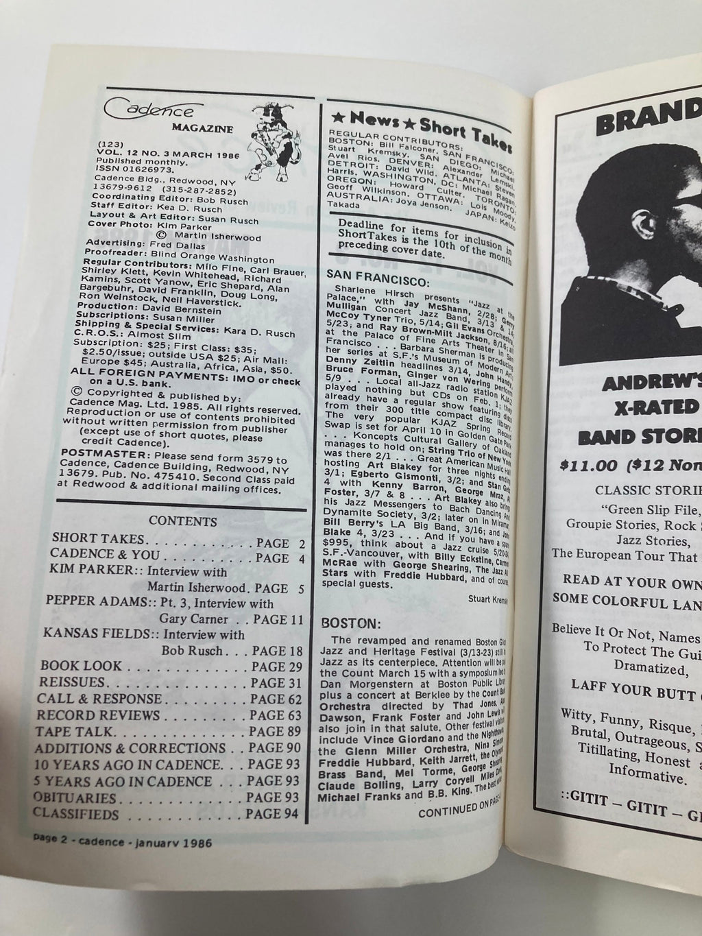 Welcome to a collector's dream with this Cadence Jazz Magazine vintage issue from March 1986, Vol 12 #3. This edition features a fascinating cover story on iconic jazz musicians Kim Parker and Pepper Adams, making it a must-have for any jazz aficionado or magazine collector.