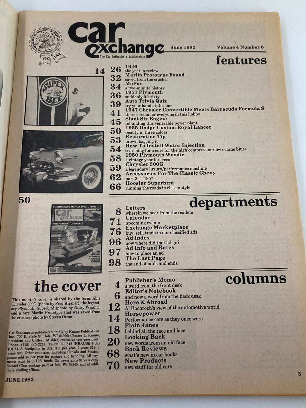 Discover the allure of vintage collectibles with the Car Exchange Magazine from June 1982, Volume 4, Issue 6, featuring the iconic Chrysler 300G. This noteworthy issue presents a captivating glimpse into the automotive culture of the early 1980s, showcasing the timeless design and performance of one of Chrysler's most formidable models.