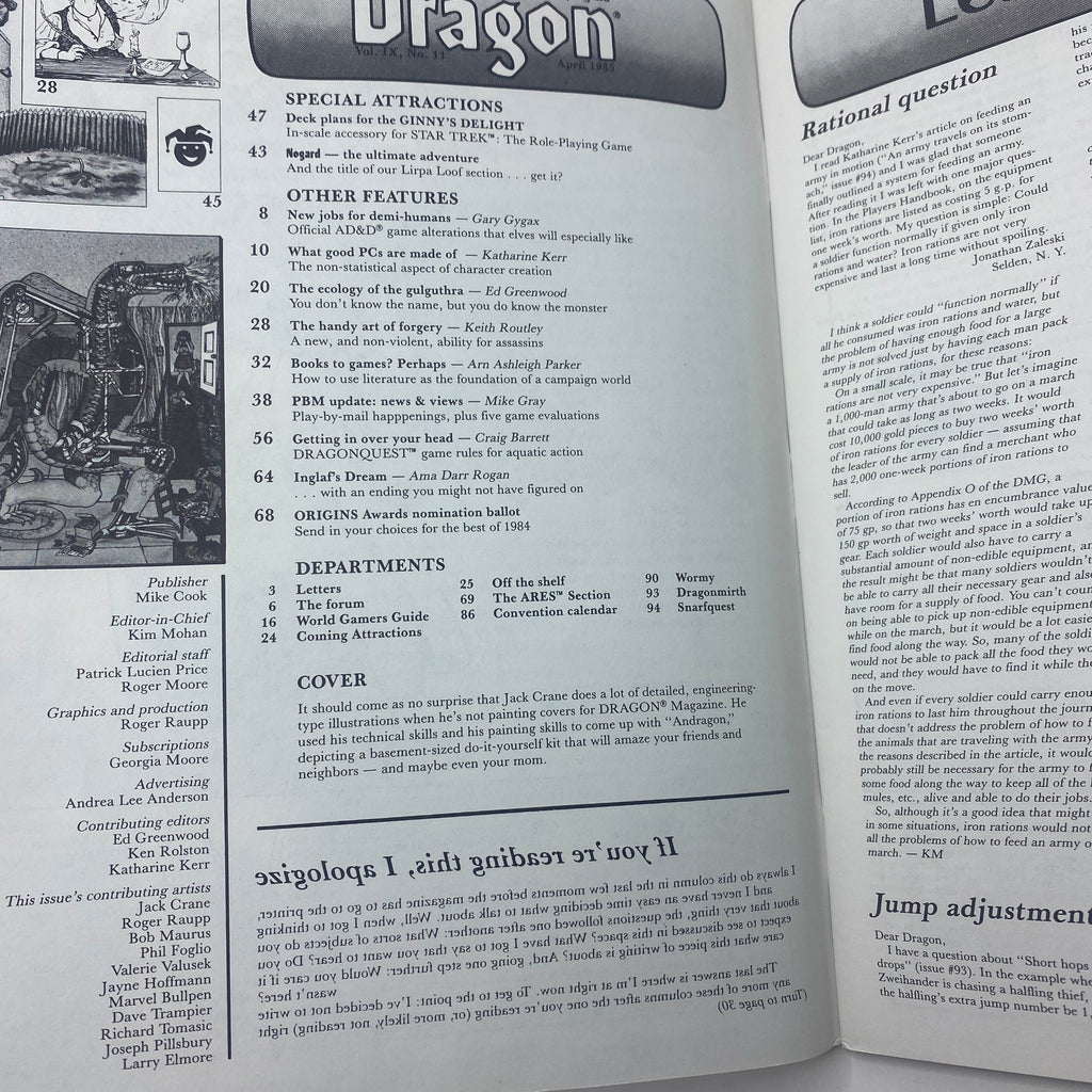 Explore the captivating world of vintage magazines with this classic issue of Dragon Magazine, published in April 1985. Featuring the striking cover art by Jack Crane, this collectible magazine is #96 in the esteemed series.