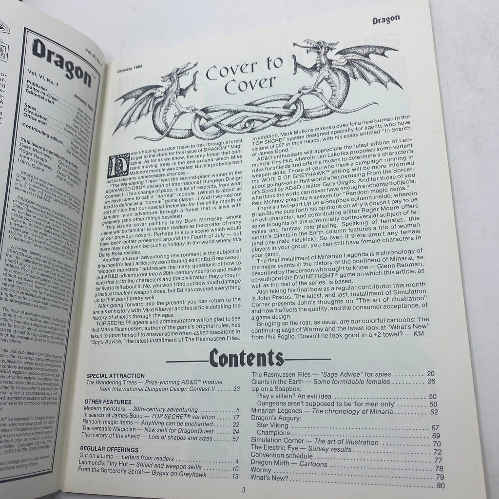 Discover a treasure from the past with this vintage magazine: Dragon Magazine January 1982, Issue #57, featuring the captivating cover story, 'The Wandering Trees.' This collectible issue is a must-have for enthusiasts of gaming and fantasy literature.
