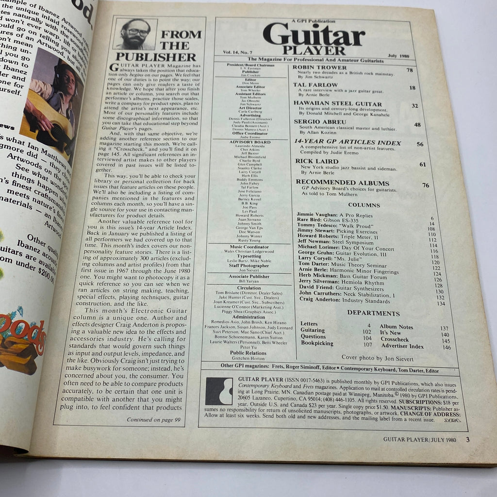 Explore an iconic piece of music history with the Guitar Player Magazine, July 1980 issue. This vintage magazine features an in-depth look at legendary guitarist Robin Trower and renowned bassist Rick Laird, making it a must-have for any serious collector of vintage magazines.