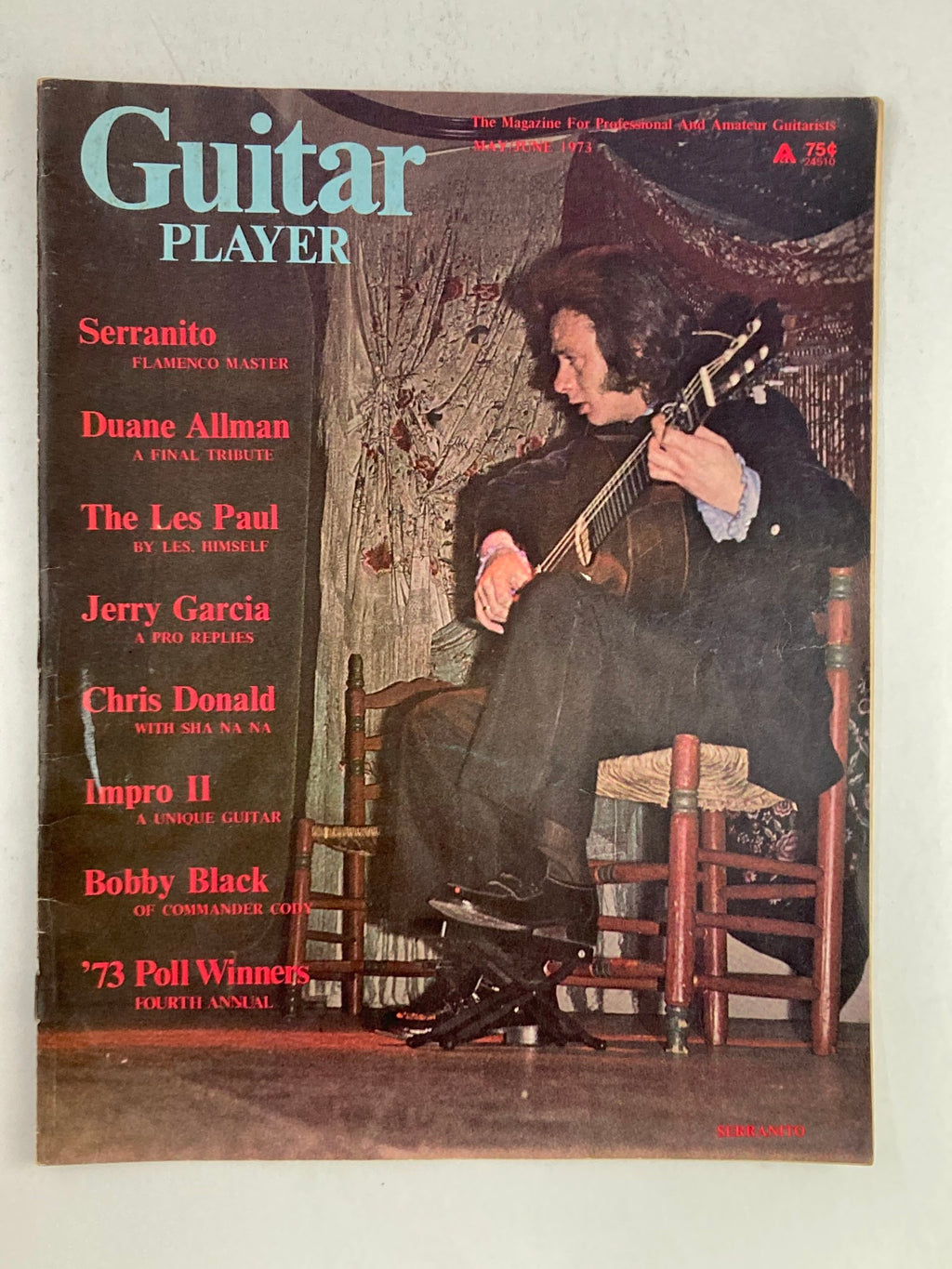 Discover a slice of musical history with the VTG Guitar Player Magazine from May 1973, featuring the renowned Flamenco guitarist Serranito on the cover. This vintage issue, Volume 7, Number 4, captures the essence of the guitar scene from an era that celebrated artistry and craftsmanship.