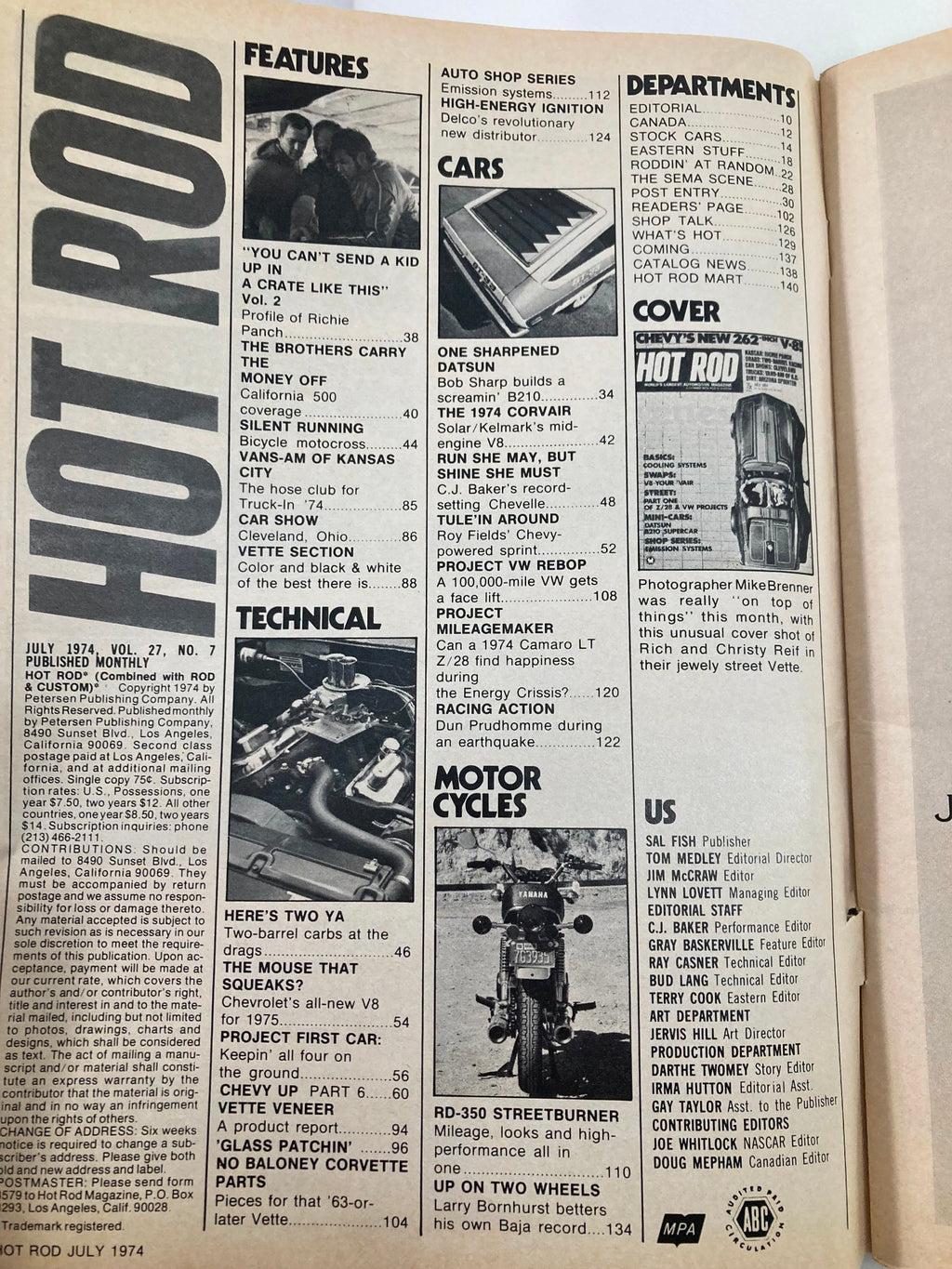 Introducing a vintage treasure for automotive enthusiasts and collectors alike: the VTG Hot Rod Magazine from July 1974, Volume 27, Issue 7, featuring the iconic Richie Panch in NASCAR. This classic magazine serves as a nostalgic glimpse into the world of hot rods and racing culture during a pivotal time in automotive history.