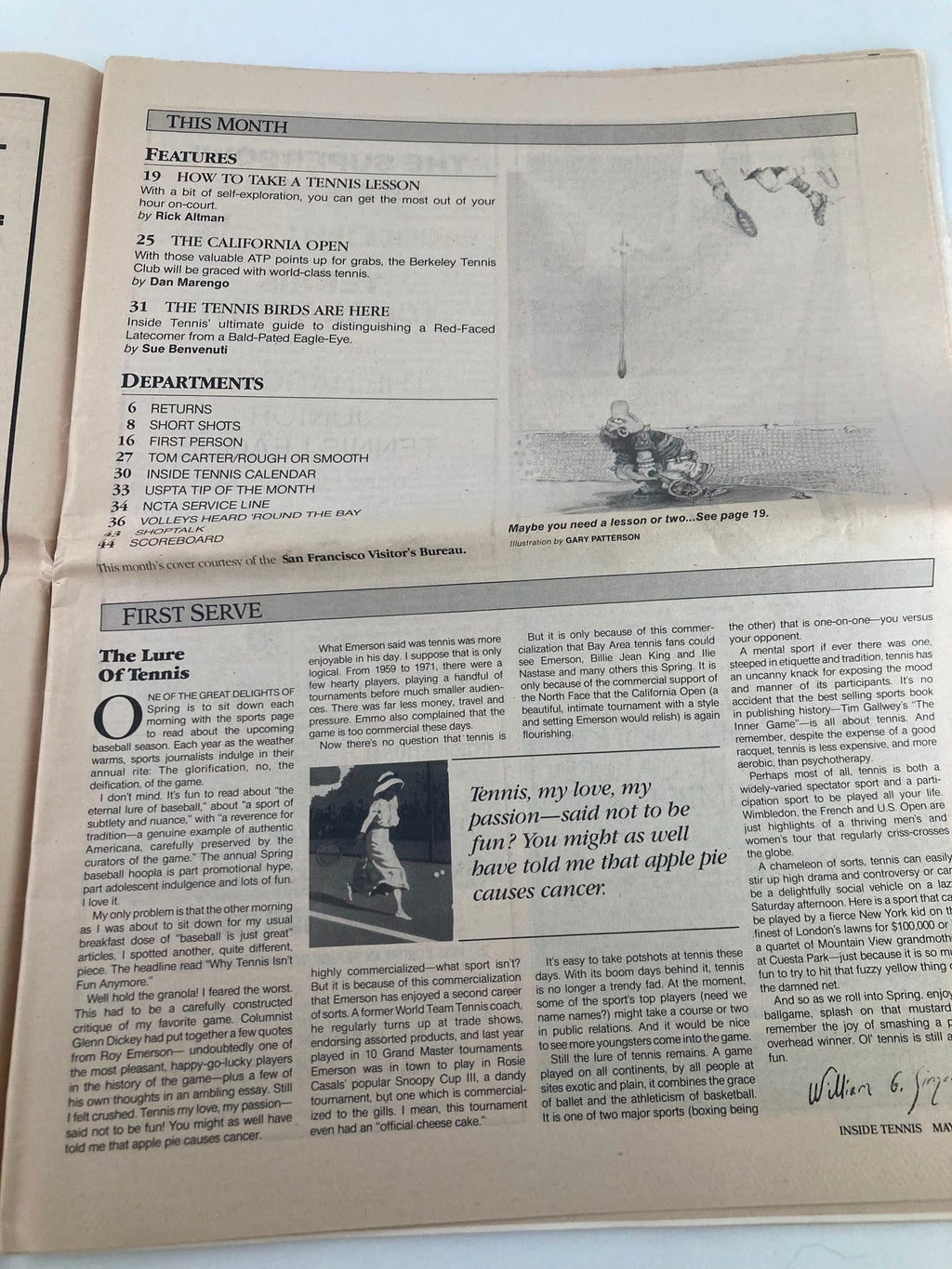 The magazine comes folded, and evidence of previous ownership is visible with writing and marks throughout. Despite these imperfections, it retains great collectibility for aficionados of vintage tennis memorabilia.