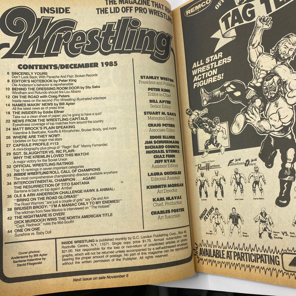 Step into the world of professional wrestling with the Inside Wrestling Magazine from December 1985, featuring the iconic wrestling duo, Arn and Ole Anderson, on the cover. This collectible magazine is an essential find for fans of vintage magazines, capturing a pivotal era in wrestling history.