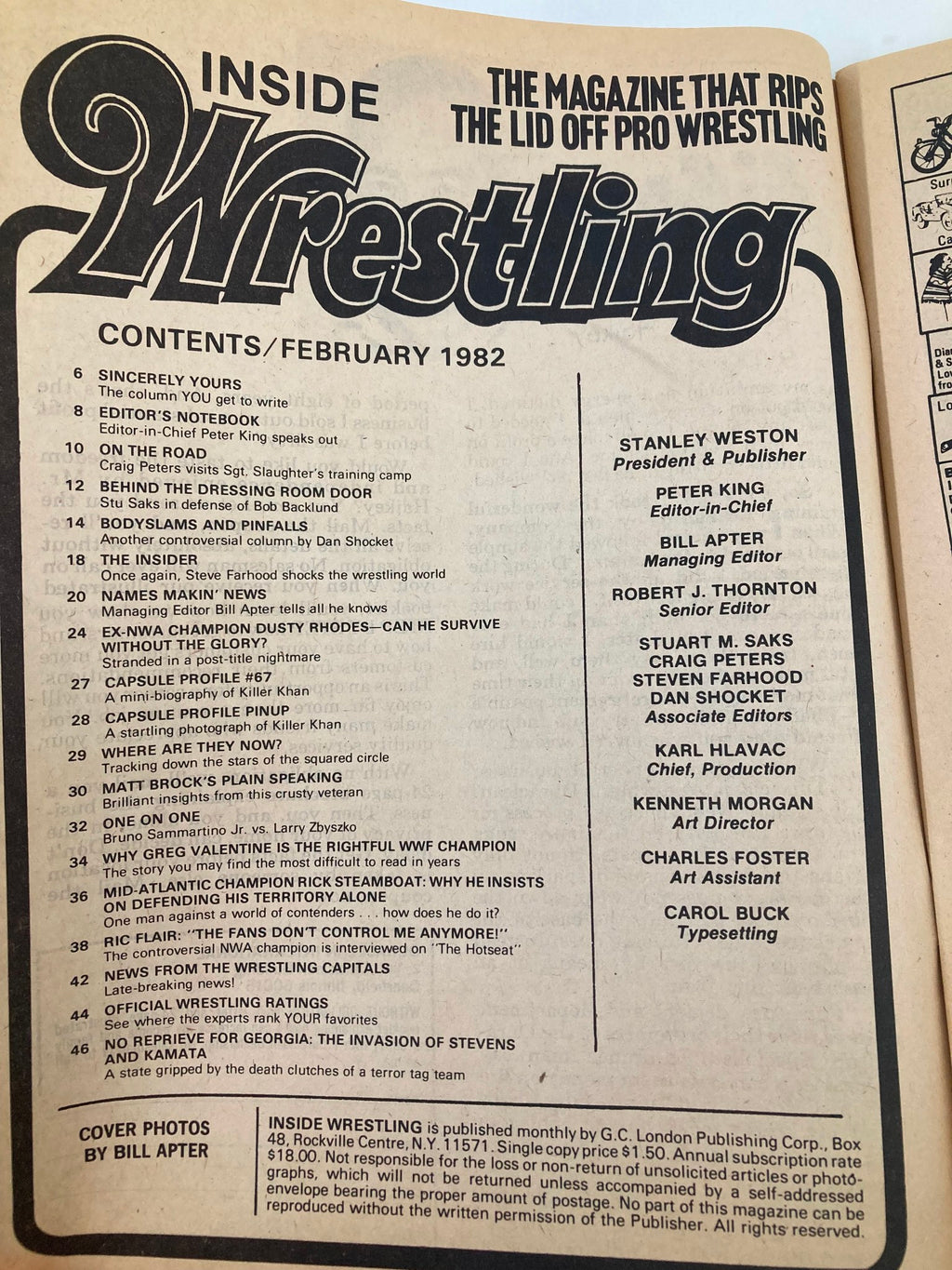 Discover a gem in the world of vintage magazines with this Inside Wrestling Magazine from February 1982, featuring the legendary Greg Valentine and the iconic Rick Steamboat on the cover. This collectible issue provides a fascinating glimpse into the rich history of professional wrestling, showcasing the sport's biggest stars and memorable events from the 1980s.