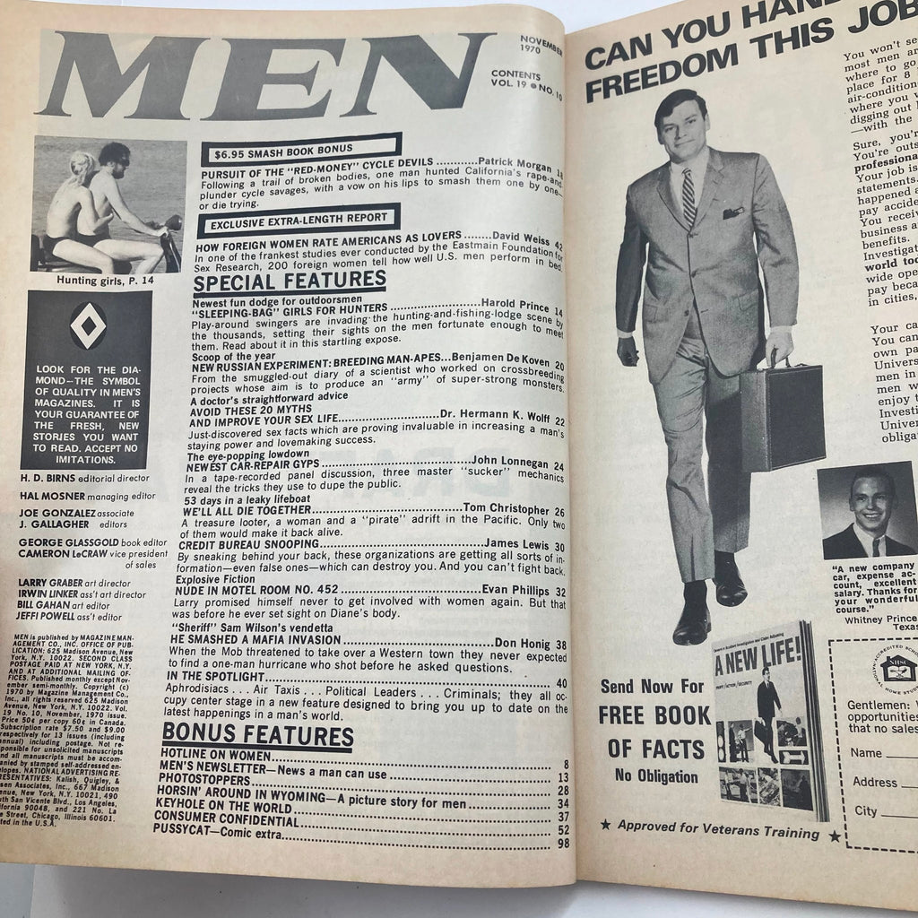 Discover a piece of history with this collectible vintage magazine: the Men Magazine from November 1970, Volume 19, Issue #10. Known for its gripping narratives and stunning visuals, this edition features the captivating headline "He Smashed a Mafia Invasion," offering a rare insight into criminal underworld stories of the time.