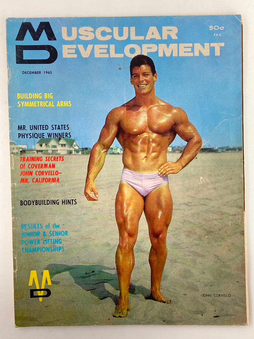 Step back in time with this vintage December 1965 issue of Muscular Development Magazine, featuring the astonishing John Corvello Jr. on the cover. This magazine is a gem for collectors and bodybuilding enthusiasts, showcasing the golden age of bodybuilding and fitness.