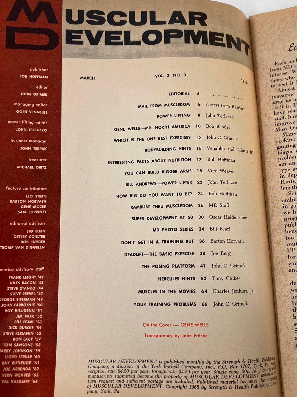 Step back in time with the VTG Muscular Development Magazine from March 1965, Volume 2, Issue #3, featuring the iconic Gene Wells on the cover. This vintage magazine is a true treasure for collectors and anyone passionate about the golden age of bodybuilding and fitness culture.