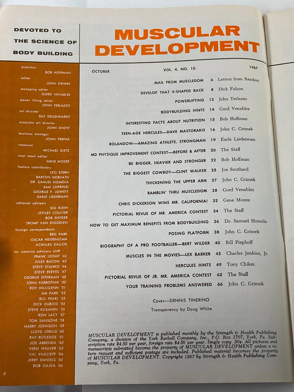 Step back in time with the VTG Muscular Development Magazine from October 1967, Volume 4, Issue 10, featuring the iconic Dennis Tinerino. This nostalgic magazine captures the spirit of bodybuilding and fitness from a golden era of muscle development. Whether you’re a collector of vintage fitness literature or simply an admirer of the bodybuilding culture, this edition is a must-have addition to your collection.