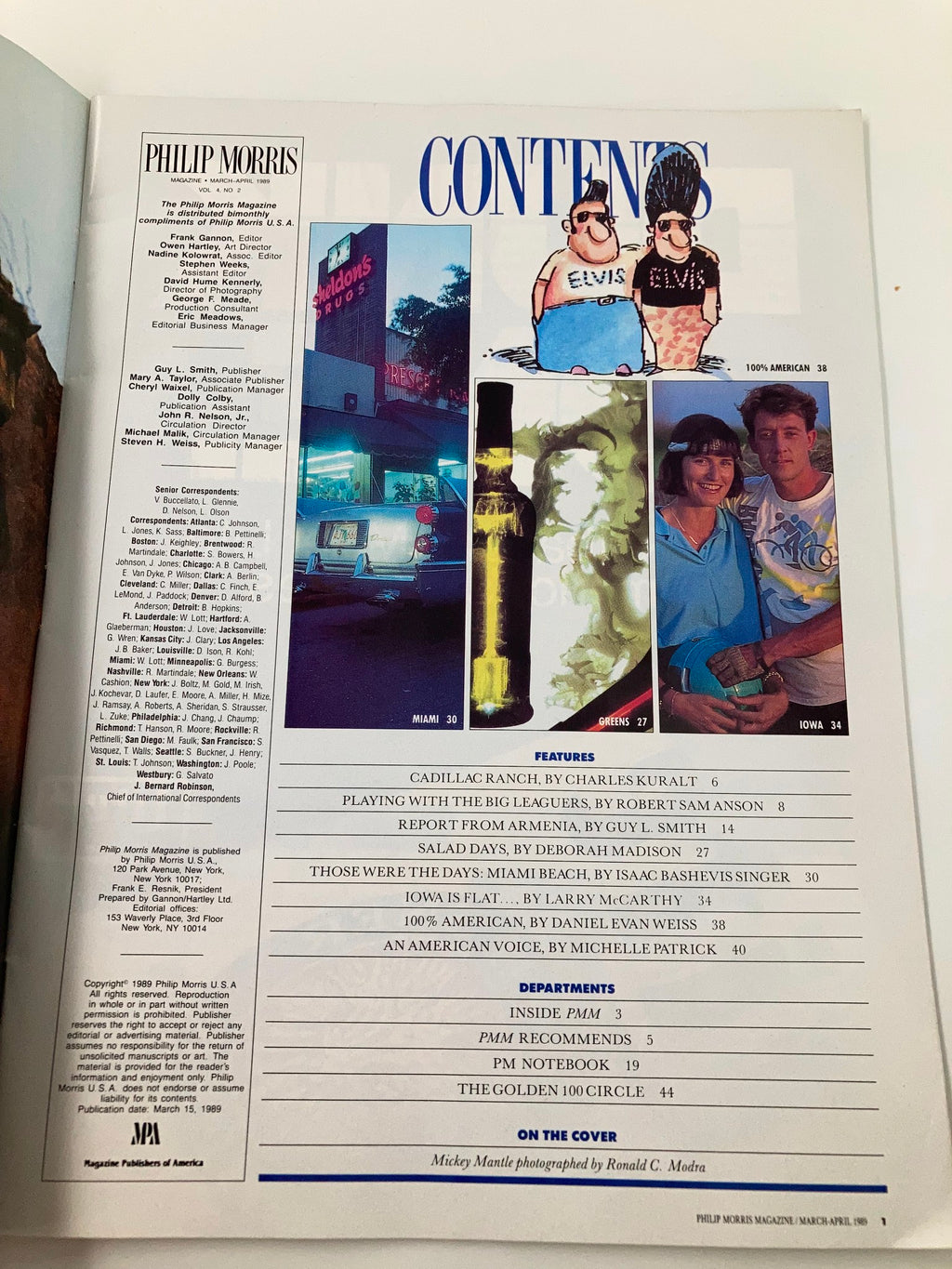 This collectible vintage magazine, titled Philip Morris Magazine, was published in March 1989 and is a sought-after addition for any enthusiast of vintage magazines. This specific issue is Volume 4, Number 2, featuring prominent figures like baseball legend Mickey Mantle and acclaimed author Isaac Bashevis Singer. Their presence on the cover highlights the magazine's cultural significance during a pivotal era in American history.
