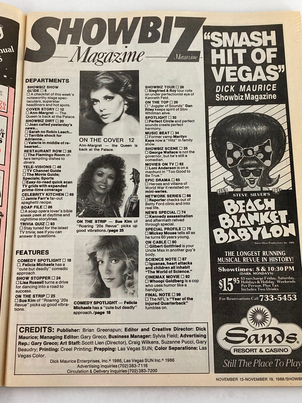 Discover the charm of vintage magazines with this rare collectible: the Showbiz Magazine from November 13, 1988, featuring iconic stars Ann Margret and Sue Kim on the cover. This issue encapsulates a fascinating period in entertainment history and will be a treasured addition to any collection!